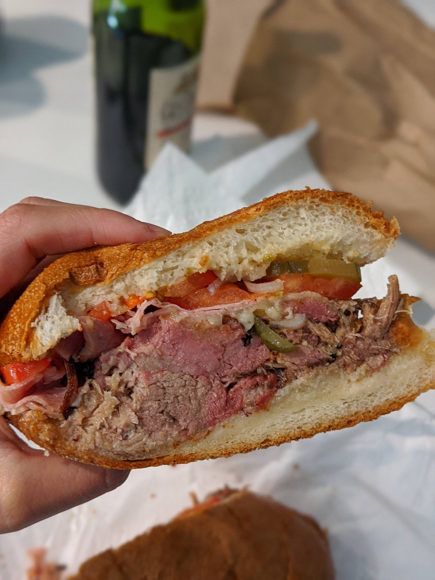 I definitely recommend the mojo sandwich. Smoked, pulled pork accompanied by bigger, super tended chunks of ham, with melty Swiss cheese, tomato, pickle, red onion, and a spicy Cuban mojo sauce, all served on a perfectly toasted roll. When I first picked up the sandwich the cheese wasn't quite melted, but as the sandwich sat there and steamed up, that cheese melted to perfection. The bread was crunchy on the outside and got that slight sogginess inside that made it soft and chewy, but held its integrity against the ingredients.
