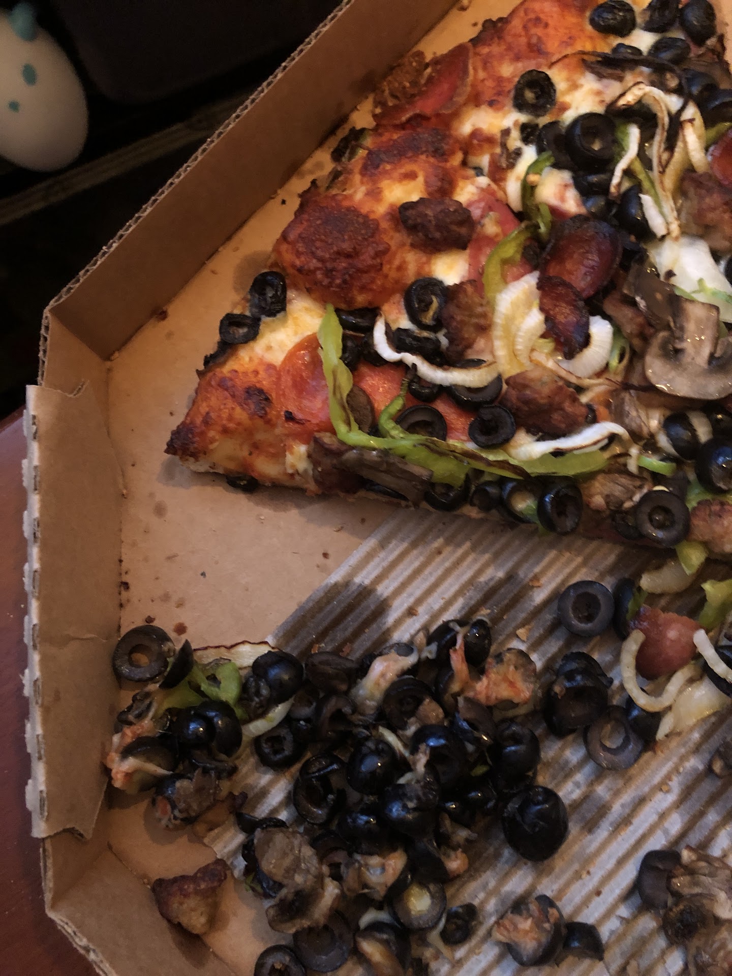 Read moreOrdered no olives and I order regularly so they have no olives on my previous orders like I always do and when I got home i saw this horrible almost un edible pizza with what looked like xtra olives. Super disappointed. Wouldâve drove all the way back to return it but they were closed. Donât order if itâs close to closing because theyâll probably throw on all the toppings you donât want to take it out on you. Ordered at 8:22 to pick up in 20 mins. Time to look for a new...