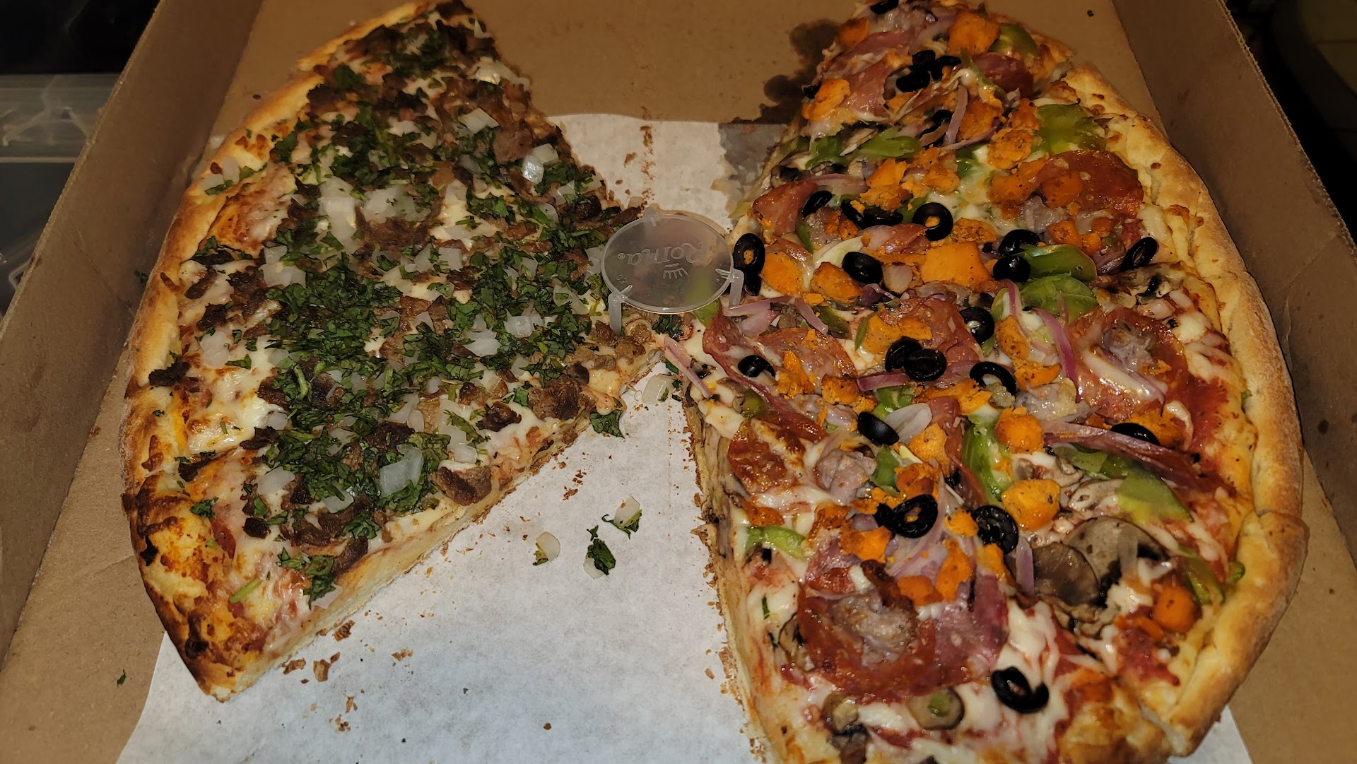 I recently ordered a medium cheese pizza for my kids and a half Super Combo and half Carne Asada. This is the first time I've gotten these two combos, and it was an excellent choice. The Carne asada was tasty, and even though the toppings were simple, the flavors were abundant, especially with the sauces that it comes with on the side. The super combo has regular toppings like salami, bell peppers, sausage, etc, but what really set it apart was the grilled chicken. It was really good.. a bit dry, but that's probably from the baking process.