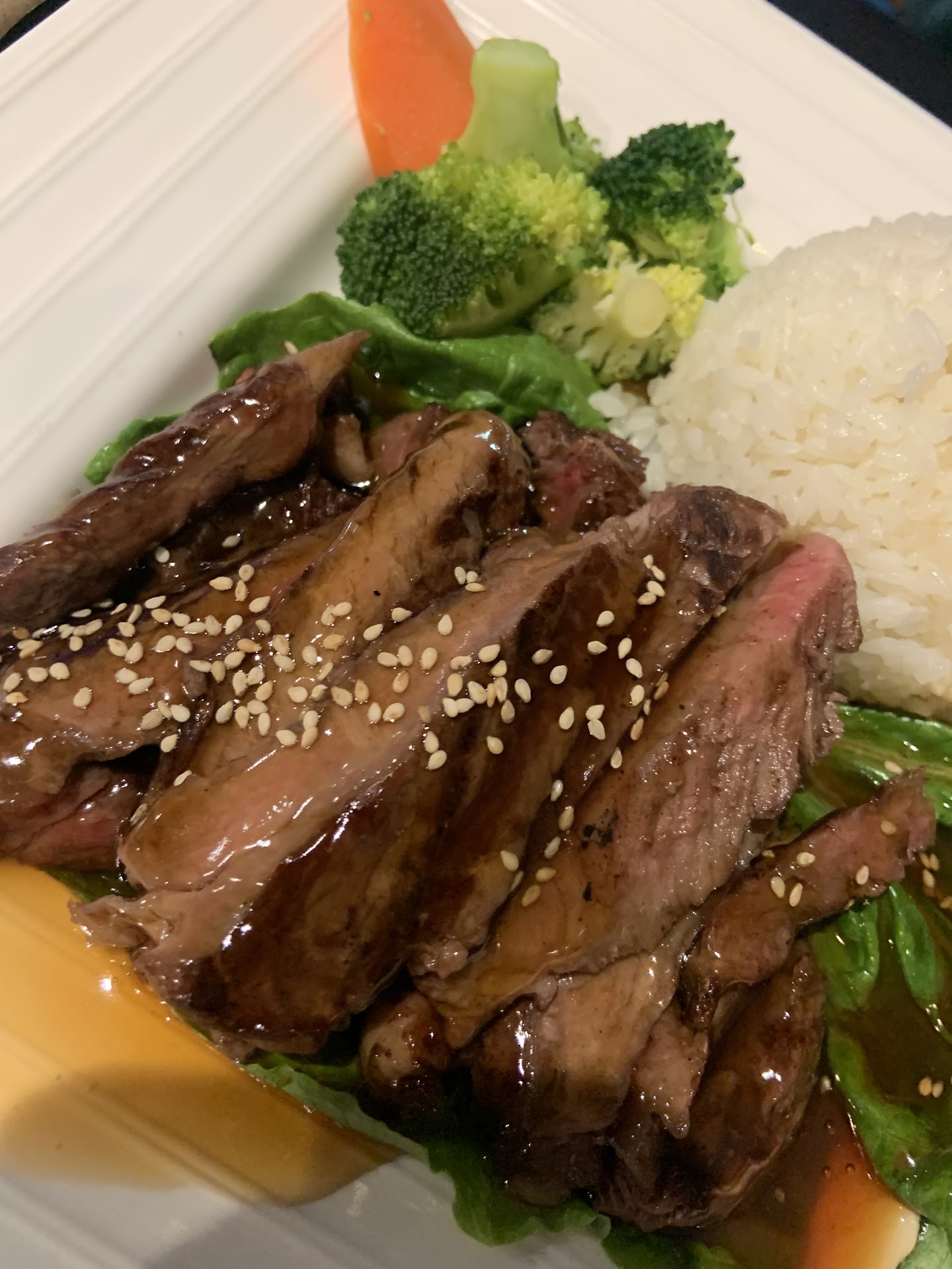 Ribeye teriyaki was VERY TOUGH. We took half of it home and used food scissors to cut it, it was a struggle because the meat was so tough.