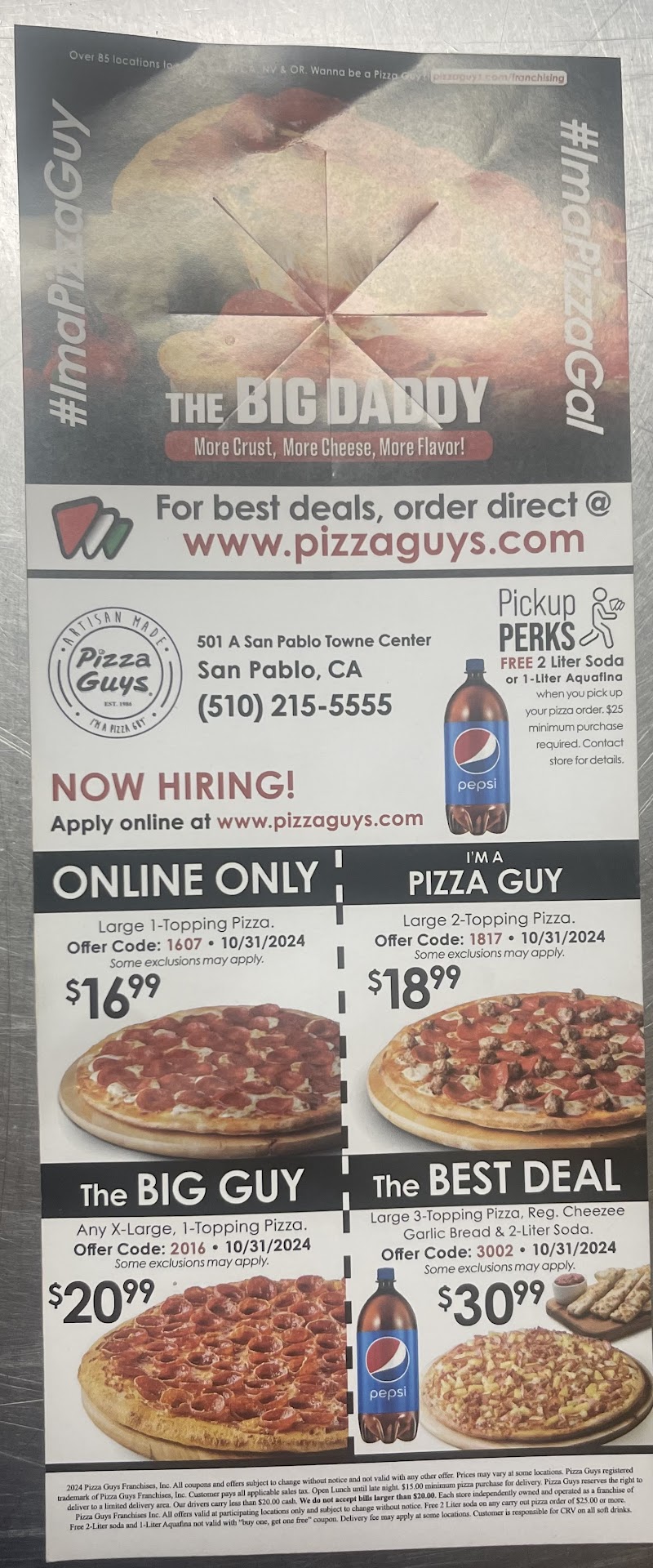 I found Pizza guys a couple of months ago and decided I wouldn't ever get pizza from anywhere but there again! Their pizza is amazing, especially their white sauce options, specifically the garlic lovers! They have the best stuffed crust as well. The reason I'm writing this review as one star is because of my last experience I had there. I had gotten off work at 8pm last friday 4/12 and called in to place an order for pick up but was put on hold, and I ended up arriving there before they answered, no big deal. I go in to make the order and a girl takes my order, she finishes, takes a call on the phone for an order, finishes that, then proceeds get started on my pizzas. She's working the dough, then scratches the side of her face, then continues working on the dough and eventually putting on all the toppings! It wasn't until she finished with the toppings that she quickly rinsed her hands (no soap) for all of 2 seconds before getting started on the other pizza. Terrible cleanliness. I then saw another employee come from the back on his cell phone, hang up, then wet his hands in the sink and dried them before starting on a pizza. They are NOT CLEAN here! Disgusting. They need to re-educate their employees on proper food preparation procedures, specifically washing hands with soap since they aren't wearing gloves. I asked for a refund from a guy there and first he said no because it was made already but I said I didn't receive it yet and then he asked me why, so she came to listen, I told him the girls hands were dirty and what she did (she then LAUGHED) and then he asked if I would like half off, to which I said no just give me my refund. Will NOT be coming back to this DIRTY,...