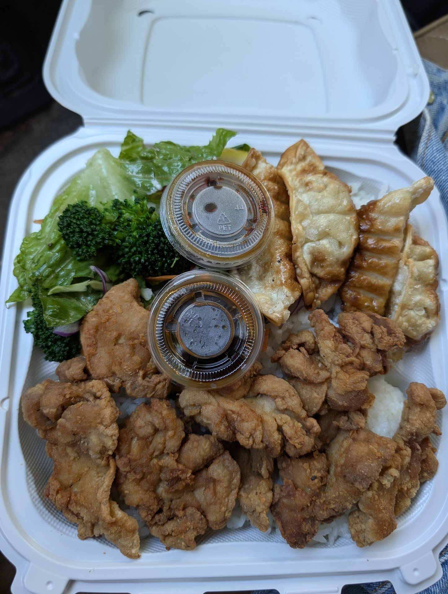 Came back to work and ate a piece of katsu chicken. It was hot, juicy, with a decent amount of katsu sauce, and perfectly flaky, 5 🌟's. The bento comes with rice, salad and 2 potstickers. The salad had a fresh lemon slice, light dressing, cherry tomato and broccoli onto a bed of lettuce. I was pleasantly surprised by the brocolli as it was a nice touch.