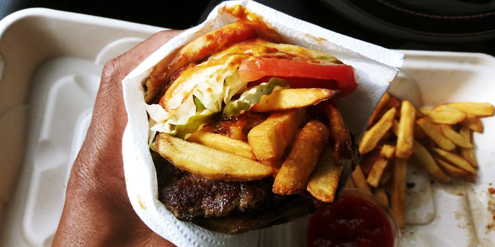 Driving from Clearlake ,back to the Eastbay. I was on Highway 101. It was about lunchtime and I was getting hungry . I pulled over to finish a few reports and I could smell food being prepared. As I looked up I noticed a small Cafe, I said "well I guess that's what I will be eating". I Googled their phone number and placed my phone order .I parked ,I went inside ,and paid for it ,and they were so nice to come outside and bring it to my van. I drove over to Larkspur and pulled over so I could enjoy this big...