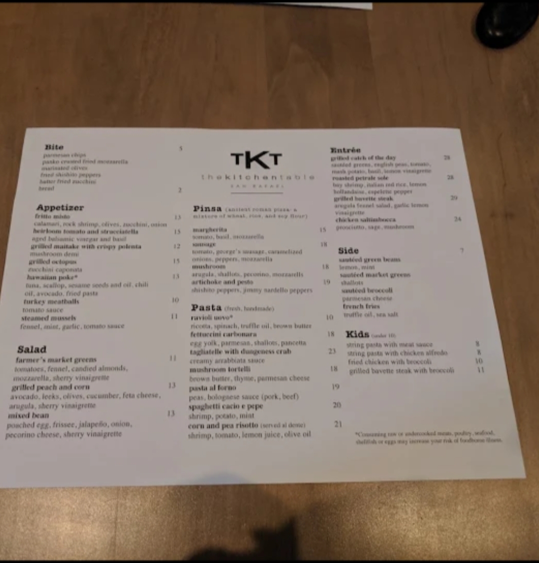 ย ย ย Read moreI dined at Alexander Alioto's previous restaurant in SF and the marvel of his raviolo uova has echoed in my brain and on my lips ever since. What a fabulous dish. There's that and much more at The Kitchen Table at the end of 4th St in San Rafael. The space is small, simple, sleek and airy with an open kitchen in the back. The menu is of moderate-size, offering a variety of options that bridge the gap between culinary artistry and Italian comfort food. Try a delicious appetizer of salmon crude with gigante beans and tomato, excellent gnocchi or risotto with seafood, (two dishes that often don't fare well in restaurant kitchens.) A vongole and carbonara as good as you will find in Italy. Chicken saltimbocca was so moist and delicious (boneless thighs instead of breast filets.) Perfect fried chicken. Dessert was a panna cotta and lemon tart both made in the kitchen. An expertly executed wine list heavy with Italian varietals and reasonable prices. We are going back soon as there are still several dishes left that we want enjoy and of course one more raviolo uova before I die. Soon this will be a tough ticket so book...