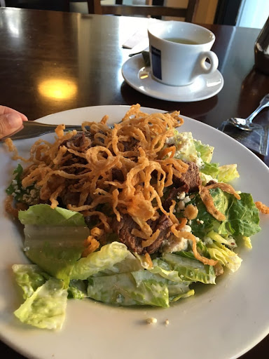 The salad was only ok, I've had better. I wouldn't order it again and I wouldn't recommend it either. There wasn't a lot to the plate, lettuce, dressing, filet steak pieces, and topped with thinly battered onion rings. While there wasn't a lot to the plate, it did fill the craving I had and the atmosphere of this cute, quaint corner lot restaurant was exactly what I needed. I had brought some books I have been journalling in, since my mom passed away, this little restaurant and plaza and its ambiance was the space I needed to get some writing done.
