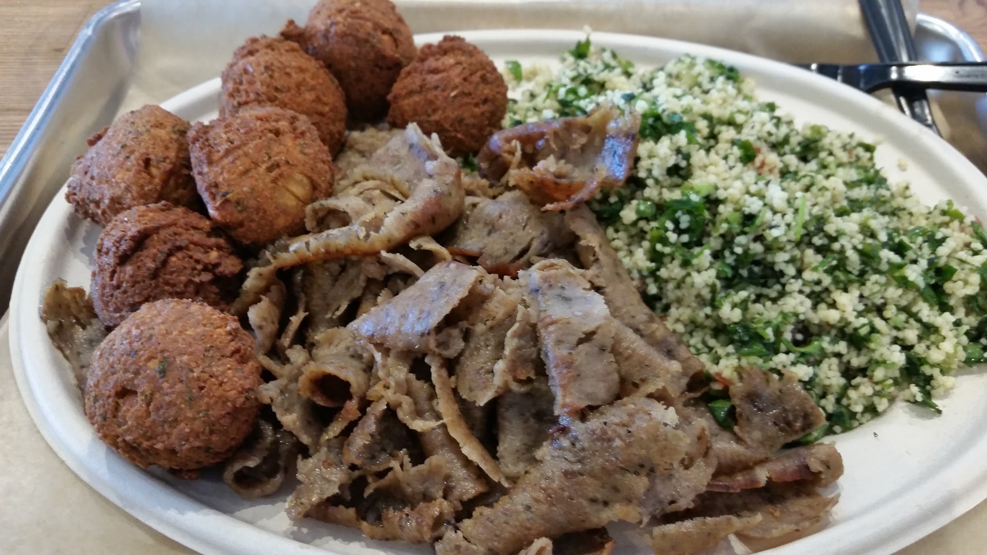 I ordered the 'plate', that came with one protein and two sides, which in my case meant the lamb and beef kebab, tabouli, and falafel. The meat was great, the tabouli was flavorful and fresh (so it had a nice texture), and the falafel were great. In fact, rayther than just the standard ground chickpeas, the falafel had some fresh chick peas mixed in as well, which was a nice twist and texture addition.