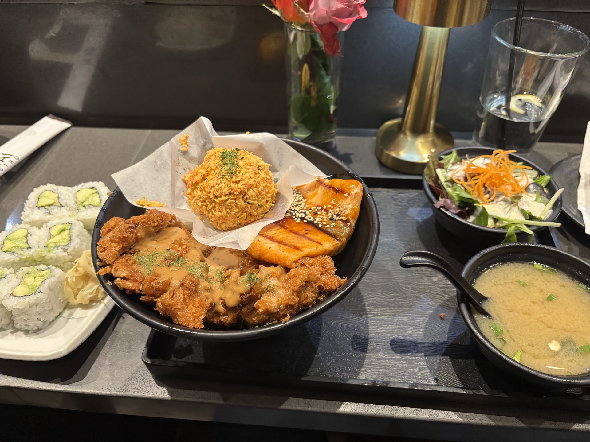 The food was the highlight of the night—everything was fresh, flavorful, and expertly prepared. I ordered the dinner special with extras, including chicken katsu, avocado sushi, seared salmon, miso soup, spring salad, and a spicy tuna rice cup. Each dish was delicious and well-balanced, with rich flavors and high-quality ingredients that stood out. The chicken katsu was crispy and tender, the seared salmon was perfectly cooked, and the spicy tuna rice cup had just the right kick.