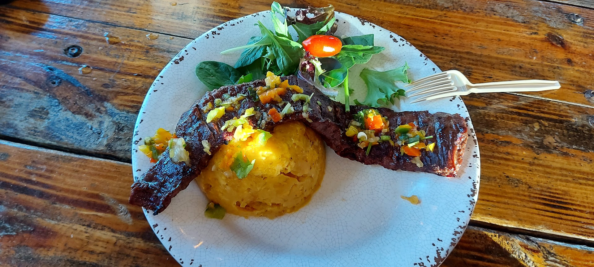 Read moreMy experience here wasn't as expected 😕, we got there around 3:00pm, after we ordered, our food took so long to come out eventhough there weren't many people. We waited about two hours for our food, and we noticed that people that arrived after us were eating before us. What a waste of time!! Also, the food was not as tasty as expected. We ordered 4 different dishes, my husband ordered the Kan-Kan porkchop, it was a good portion but it wasn't seasoned enough, it didn't taste good, for my kids I ordered breaded chicken tenders with mamposteao rice, the chicken was ok, the rice was reallygood and flavorful, my oldest son ordered pasta, this was a good dish, and I ordered skirtsteak with "bifongo" which is a combination of sweet and green plantains, the bifongo had some undercooked portions of plantains and the skirtsteak was not good, it tasted wired... Moreover, they only serve nonalcoholic beverages, and they charge you about 5 dollars for a Not home made 12 oz juce, that was gross... My experience was unpleasant, I do not...
