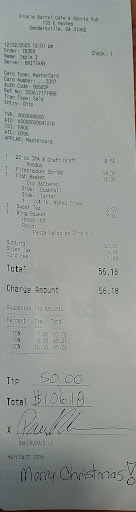 Read moreWe went to the pickle barrel 1/26/25 we were a party of 15. We called two days ahead to ask for reservations. They do not accept them. We did let them know ahead a time that we would be eating there after a funeral . Once there, there was only one other table already eating. Our order was placed drinks came out at ok time frame. However the restaurant began to fill up. Our food came out in spurts. Some people from our party had food while others waited 30 mins for theirs. Three people didnât get food at all after waiting 2 hours. The other people that came in after us were all being served. This was completely infuriating. When we asked where our food was they stated they were sorry but did not offer an explanation. We complained twice about the missing food. The waitress then became defensive and walked away. This was the very first time I did not tip a waitress. Very poor service but from what I was told by others in our group that did get to eat their food it was great.