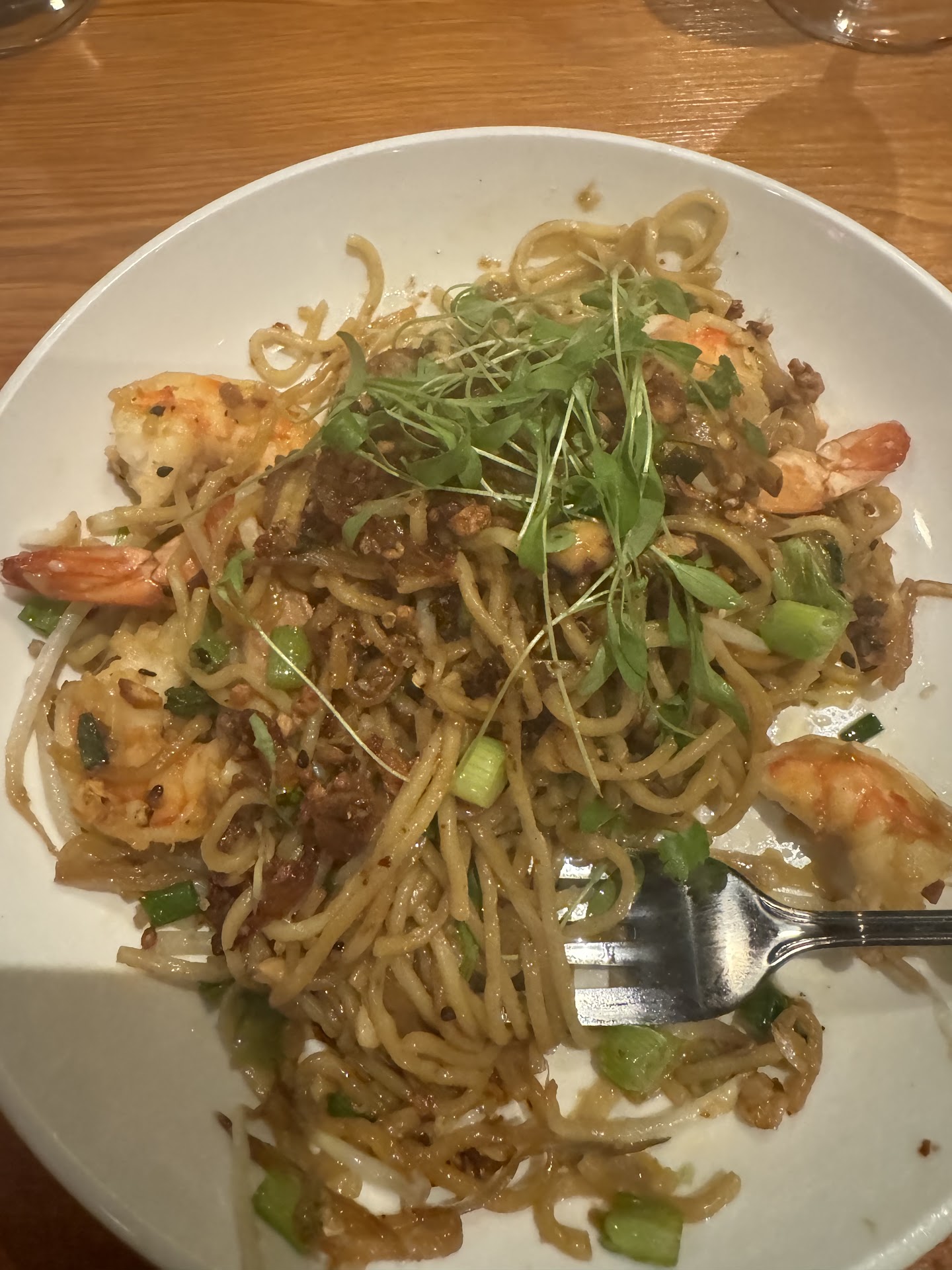 Oh my goodness! This place makes me want to move to Sandpoint! My daughter in law made reservations for an 8:30 dinner after the high school graduation having never been here before. We dined in the main dining area although they also have great outside dining. Our son ordered 2 servings of Pork Bellies as an appetizer for all of us. They were served with cucumbers. This is a dish I’ve never tried before and it was delicious. The 5 of us left crumbs. Our server was upbeat, engaging and efficient. Each of us ordered a different dish and we were all very impressed with the flavor and quality. Upon the first bite, we were impressed enough to encourage taste testing around the table. Our daughter in law ordered an appetizer of shrimp in peppercorn sauce with leeks, mushrooms, and crostini. I will definitely return for that and may lick my plate to get every succulent morsel. Her mother ordered expertly seared salmon on a bed of the most flavorful roasted cauliflower hummus I’ve ever tasted. My choice was the spicy shrimp with a perfect amount of heat. I devoured the shrimp and half the ramen, bringing the remaining ramen home for reheat with scrambled eggs and sausage links. The restaurant was slated to close at 10, but due to the activity of the community it was still going strong when we left with no evidence of an intended closure on the customers who were being cheerfully seated and handed menus. This establishment is obviously well run from top to bottom, with the entire premises clean and well maintained. Had it not been a 55 mile drive from our son’s house, I would have been there for dinner the following night. Every dish I tried was perfectly seasoned and delicious, in addition to an appealing presentation. You can’t go wrong on your order. *I didn’t try the carne asada, but our son was surprised it was not sliced. No picture of that dish...