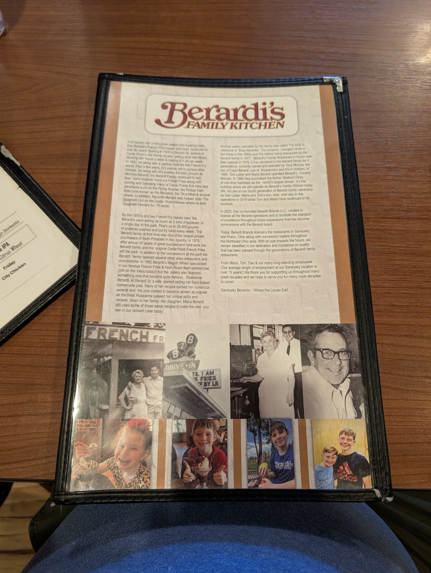 Read moreLike many tourists we stopped at Berardi's while on a trip to Cedar Point. We stopped in on our way to the park and met Amanda. She was absolutely lovely (everyone we interacted with truly was) Amanda treated us like we belonged and she encouraged my 10 year olds plethora of questions. And the food! Portions are generous and the food is genuine home cooked deliciousness. We had the burger with brisket, Ruben and Nashville Mac and cheese. Not a word was exchanged while we devoured our meal. We also, despite being utterly stuffed shared a peach bourbon crumble. It was incredible. We were in Ohio for three days and before we left we absolutely had to have lunch at Berardi's we were seated by the hostess and received waters, Amanda come up to our table and excitedly welcomed us. "I'm so glad your back!" She recommended some dishes we shouldn't leave Ohio without trying. We have chicken ranch sandwiches with Alfredo bites, Nashville chicken with onion rings and a cheeseburger with fries. Those Alfredo bites were so so good and the food was home cooked goodness. Now I've written enough of a novel here, so, I'll just say the desserts are also a absolutely cannot miss. Berardi's and it's staff are an absolute gem. We will always be eating here while visiting in Ohio. This place feels like family, like they want you there and they love cooking delicious...