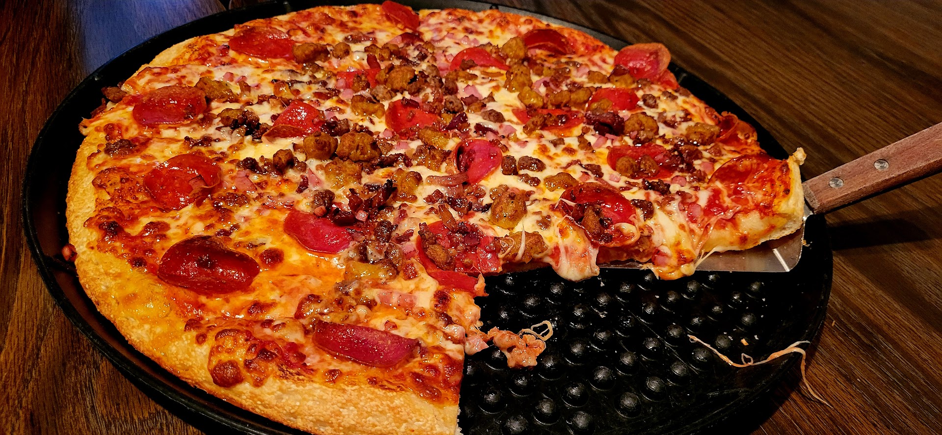 The atmosphere is sports bar meets pizza dive, it is definitely a local hangout. Which means it is good! You should give this place a try. We only had the pizza but what we did have was pretty great, and the service was really good! It's a little loud in there when there's a lot of people but that's to be expected from a...