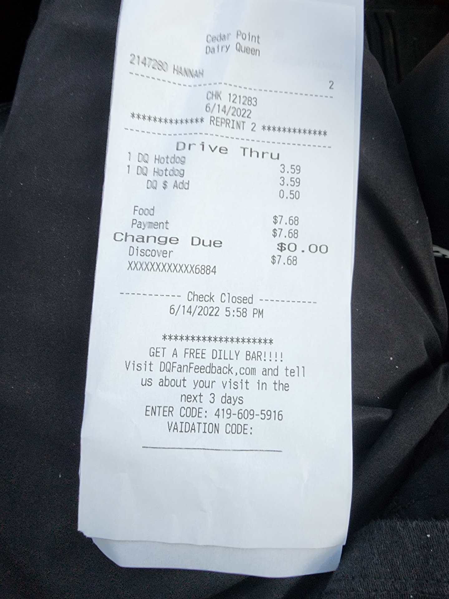 I got a blizzard from here on the way out of cedar point and it had very little toppings in it, and it wasn't mixed. I'm saying the bottom 75% of the blizzard was just fanilla soft serve.