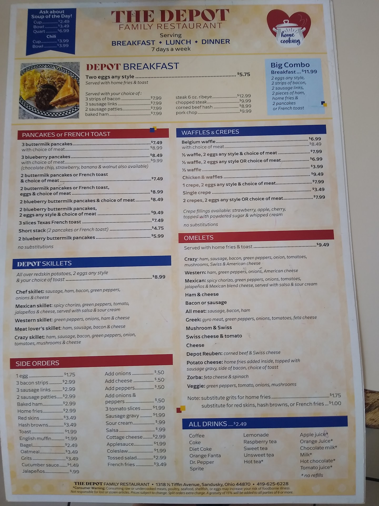 Read moreThe Depot family restaurant is my go to every time I'm in the area. I spend a lot of time at Cedar Point and camp nearby. It's such a good place for me to fill up before I go to enjoy the day at the amusement park. The staff is very nice to every customer. Never been treated poorly or felt out of place. The restaurant is not big and that's what I like. It has that small town amazing food thing that we all love. I'm a huge fan of great breakfast. I suggest if you are in the area that you give them a try. The restaurant is not huge but they have moved tables for us in the past and never had a problem...