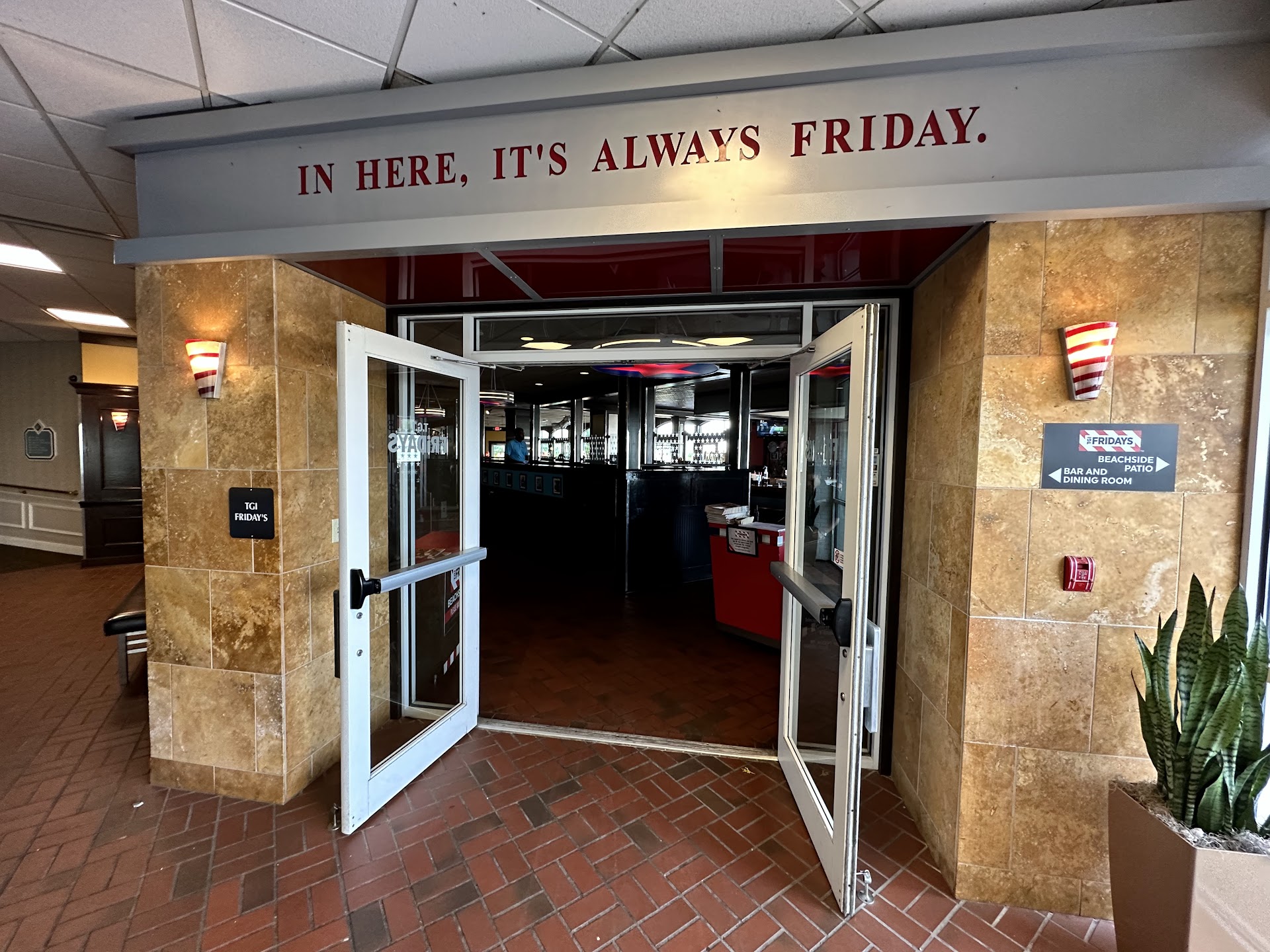 Read moreThe plus side is that it is very convenient when you are staying at the hotel. Now for the downsides….plan on slow service and people that just don’t really care because they know the business is going to come to them. We went there 2 nights and here are my observations. Both nights we sat at the bar. They had 5 people working the bar and 3 of them just spent their time cleaning versus helping out the other people. We watched 1 bartender handle not only the bar but the tables around the bar. We pretty much expected slow service, but one bartender just looked around and never helped anyone. The food is just ok…the chicken whether the sandwich or the wings are so over breaded that you have more breading than chicken. One person in my party ordered the same cheeseburger with cheddar instead of American both times and they still came out with American on them. If this would be a stand alone Friday’s, it would be gone already, but when you have a captive audience things are different. Also, if you are going to print late night menus, please make sure your spelling is correct. To me this is a sign of laziness, especially when you can’t spell the word “chips” correctly. My word of advice to anyone going there should plan on slow service and the occasional attitude server.