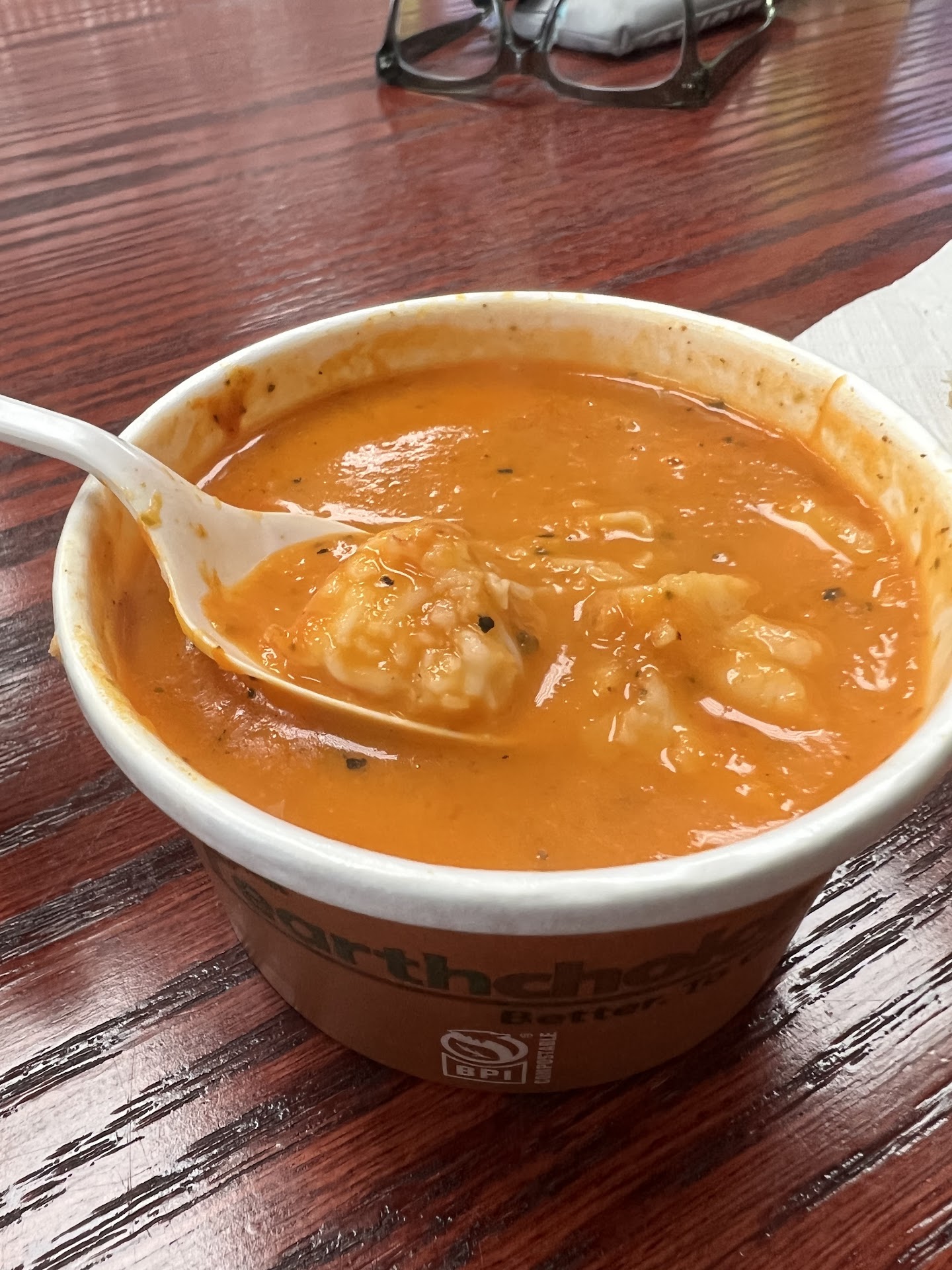 I'm a lobster bisque fan, so I ordered a cup of that as well. It was good but different. It's a roasted red pepper lobster bisque. It says spicy on the menu, but I didn't think it was. I'm glad I tried it. It had a very unique flavor. For me, the peppers just took over the flavor too much. It's still a good soup, though.