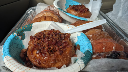 We ordered a mixed dozen, with two maple bacon (added for added cost) and waited. The donuts were made to order and came in a nicely laid out tray. We sampled the maple bacon and it was delicious, amply supplied with real bacon and a just-right maple glaze.