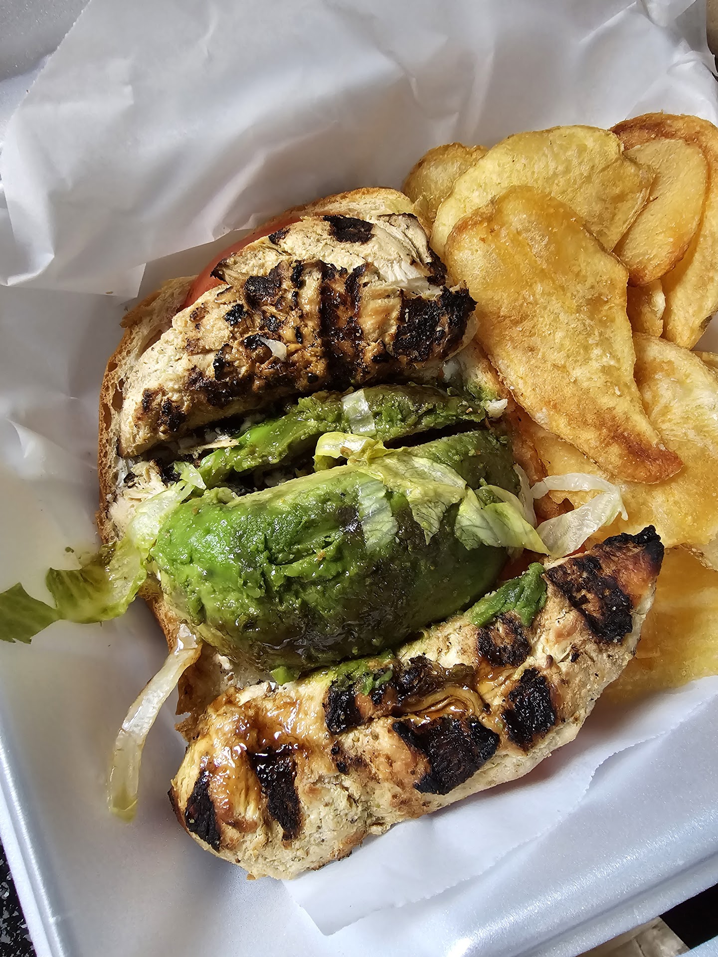 Ordered a chicken avocado sandwich, large Italian sub with lettuce, tomato, onion, standard oil and vinegar, 6 wings, and fries.
