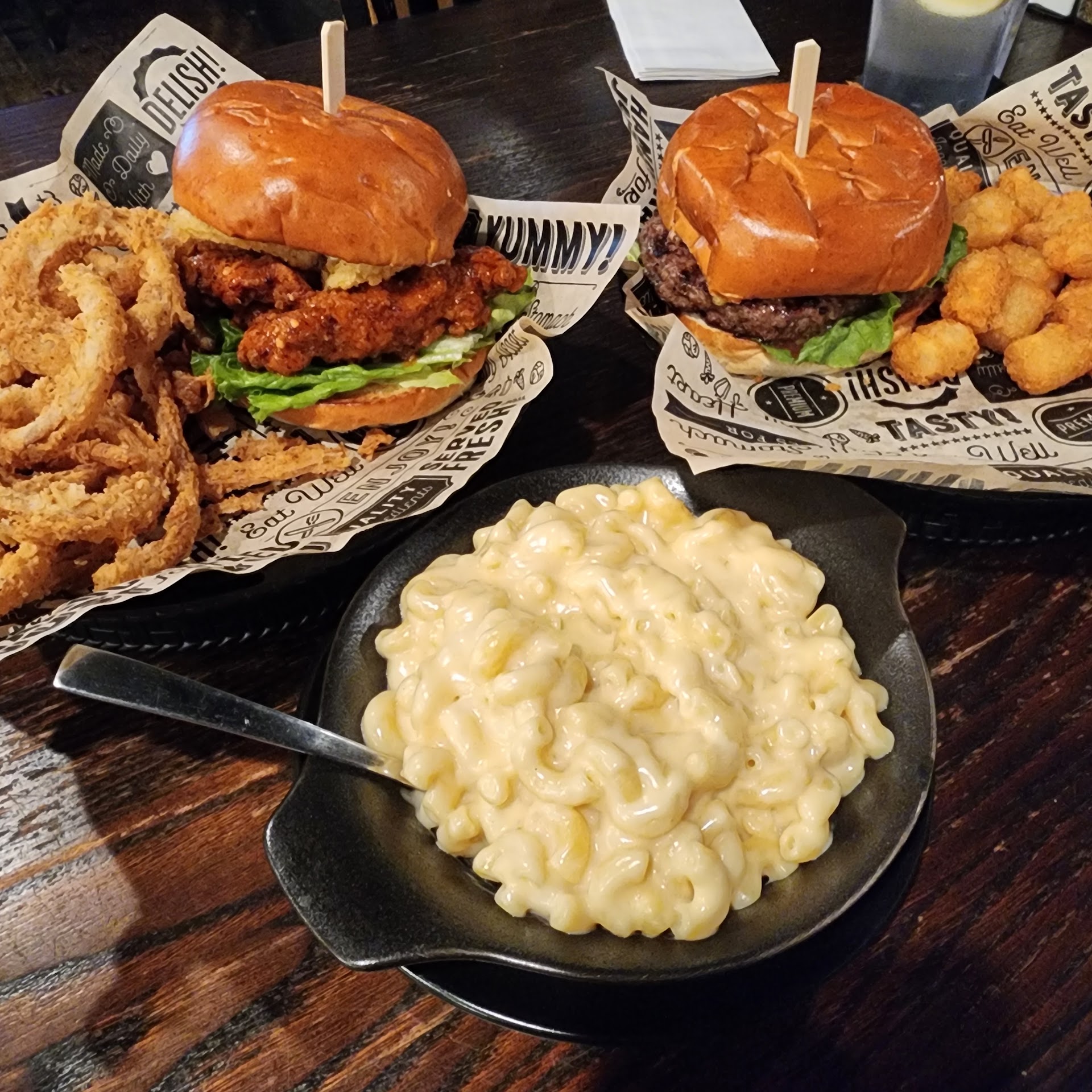 When our food finally arrived, I had the chicken sandwich with onion rings. While the onion rings had a great texture, they were completely flavorless. The sandwich itself consisted of a few pieces of chicken pounded so thin they had the texture of jerky. My girlfriend ordered a burger with tater tots. The tots were great, but the burger was bland and soggy. The mac & Cheese tasted like a frozen meal.