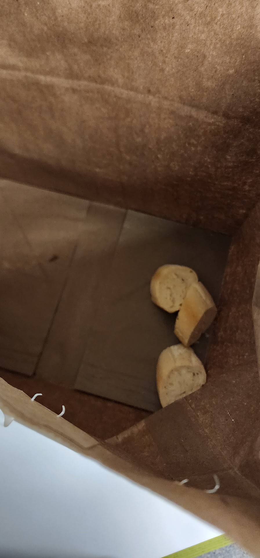 The food arrives, I open the bag and small pieces of bread are just thrown inside for us to just grab I guess. This was very unsanitary and ridiculous in my honest opinion. No one wants bread thats just thrown in a bag. A simple paper wrapping would have worked just fine but nope. Just thrown in the bag.