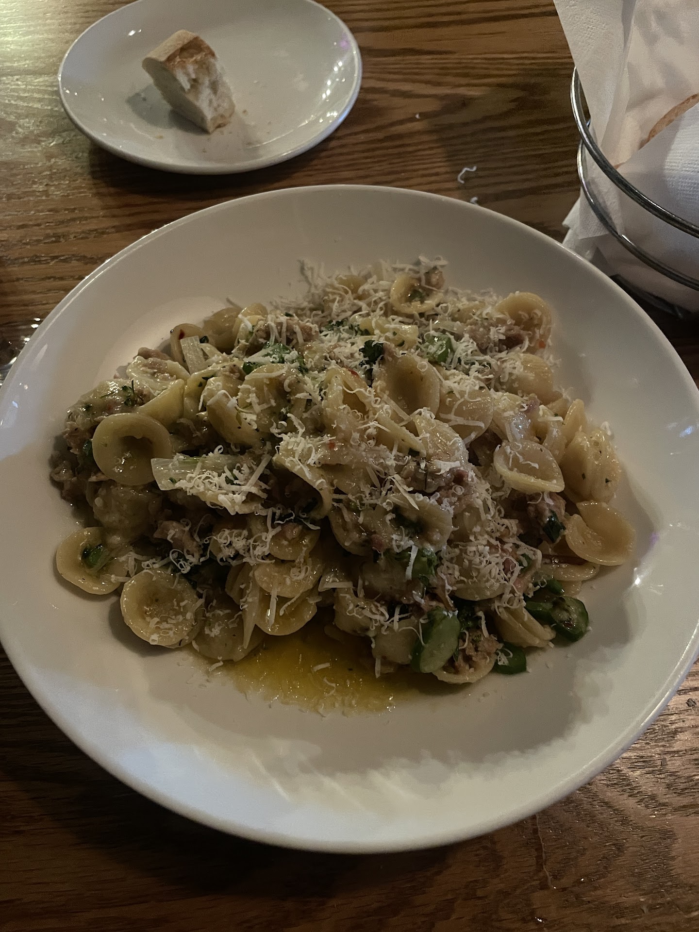 We loved this place a few years ago when we lived in Sandy Springs and came to Cibo e Beve this evening for dinner after a couples massage. The food was good but service was slow, not on point, and our waiter was completely disengaged. I don't expect to be treated like I'm at a four -star but the waiter should at least act like he cares. He would rush and run constantly while attending all if his time at the table next to us. We got the appetizer with the spicy capiccola, prosciutto, and cheese with some candied walnuts (which I think are just the bourbon-candied pecans from the Whole Foods nearby), but there were only three small thin pieces of crostini to go with the meats, and they didn't bring our bread until after we asked after our appetizer finally arrived (an appetizer that requires no effort but grabbing stuff and putting it on a wood block). The bread had three small slices and I joked with my spouse that of all if the things to skimp on bread and crostini are poor choices because they're the cheapest thing there! The place has lost its charm for us, even though the food is good. It's not worth $33 for a filet. We didn't bother to get dessert because we were tired of being disappointed by our waiter. We wanted to know what kind of pinot (what year, etc.) because he took the menus before even taking our order by stopping, taking our menus as if talking our order (although that's weird because sometimes people need to see the menu to point there's own out), and then rushing to the table next to us and completely ignoring us. It felt like he was taking our menus away for taking too long to choose.When I said I'd love to know more information about the wine, and he dropped our ticket off so quickly without giving us a chance to stop him (the way he was the entire time), he commented that he's just a guy who moves fast. He didn't say anything like "What can I help you with" just really cold. I am not extremely picky but I expect service to support these price point and I get better service at Waffle House on a sleepy Sunday morning when I don't want to go anywhere. Another weird thing happened when he was talking once again forever to the people behind us. They asked what Cibo e Beve means and he said "food and dance" which made me chuckle because anyone remotely familiar with Italian knows that Beve shares the same root as the word beverage. We acted like decent people and still gave a decent tip (20%) but he could have gotten much better. Two entrees, a skimpy appetizer plate, and one glass of wine later we were over $90. We paid for a pleasant experience and got a waiter that belongs at Golden Corral. He was tall, dark, with short cropped hair and glasses. Oh, and he told the table behind us that he's been there for five years, but when I asked for a favorite I got just a couple of years ago he says he didn't remember them every second it although at the time it was...