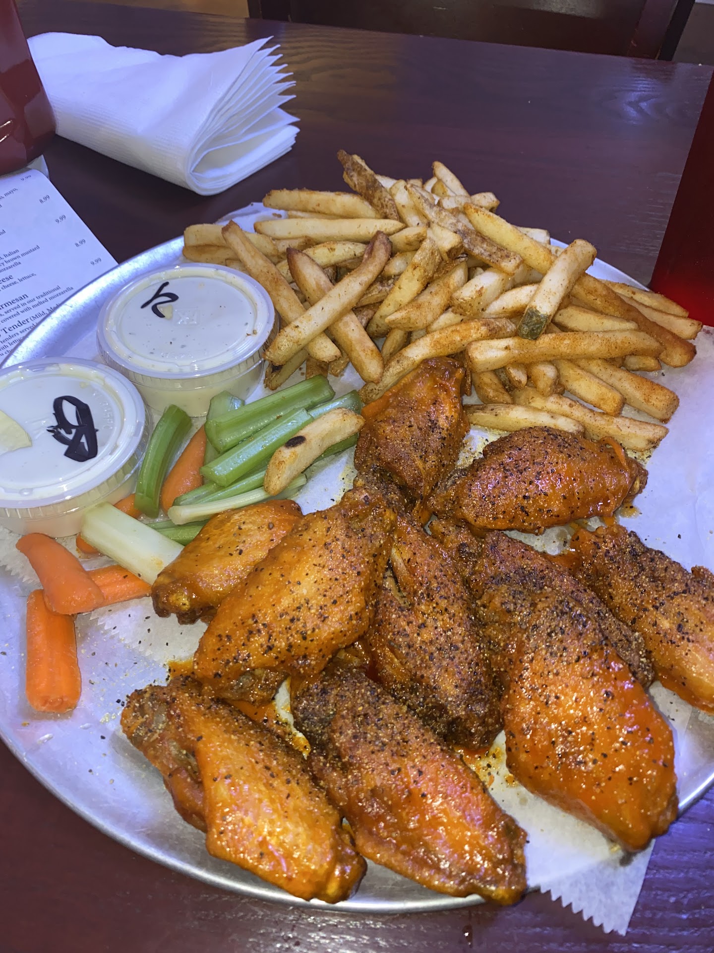 I ordered the Buffalo platter, ten wings with cajun fries (can't pass those up!) half hot Honey BBQ and the other half hot Honey mustard. The wife got ten wings with my third favorite flavor, hot lemon pepper, on them and we had our food within ten minutes. My wings were slightly cool and I kindly asked our waiter if they'd reheat them and he went above and beyond and had the kitchen make a whole new batch of both wings and fries!