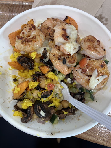 I ordered the shrimp bowl loaded with yellow rice, cucumber mix, roasted veggies, chickpeas, and moreâall for under $15! It was light enough to feel energized and fulfilling enough that I left with a happy belly and no leftovers. The hibiscus lemonade was the perfect fresh-tasting companion to my meal.