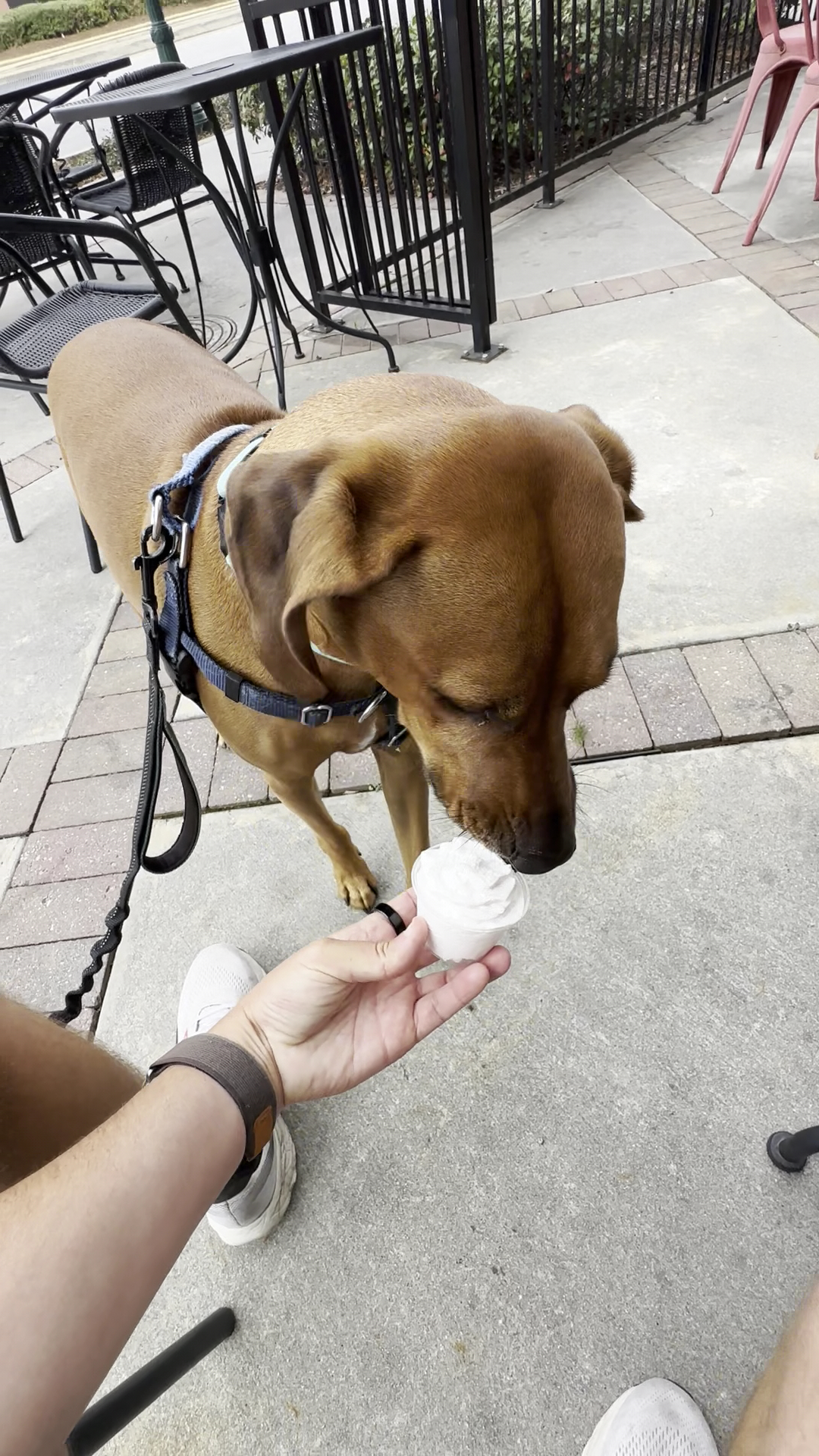 The muffin was so moist, it stuck to your teeth. This was incredible. The girl behind the counter offered my dog a pup cup, which my dog does not like that sort of thing, but I accepted it anyway as it came with a jerky treat. My dog took the jerky treat out, ate that, and then did not want any of the rest of the pup cup.