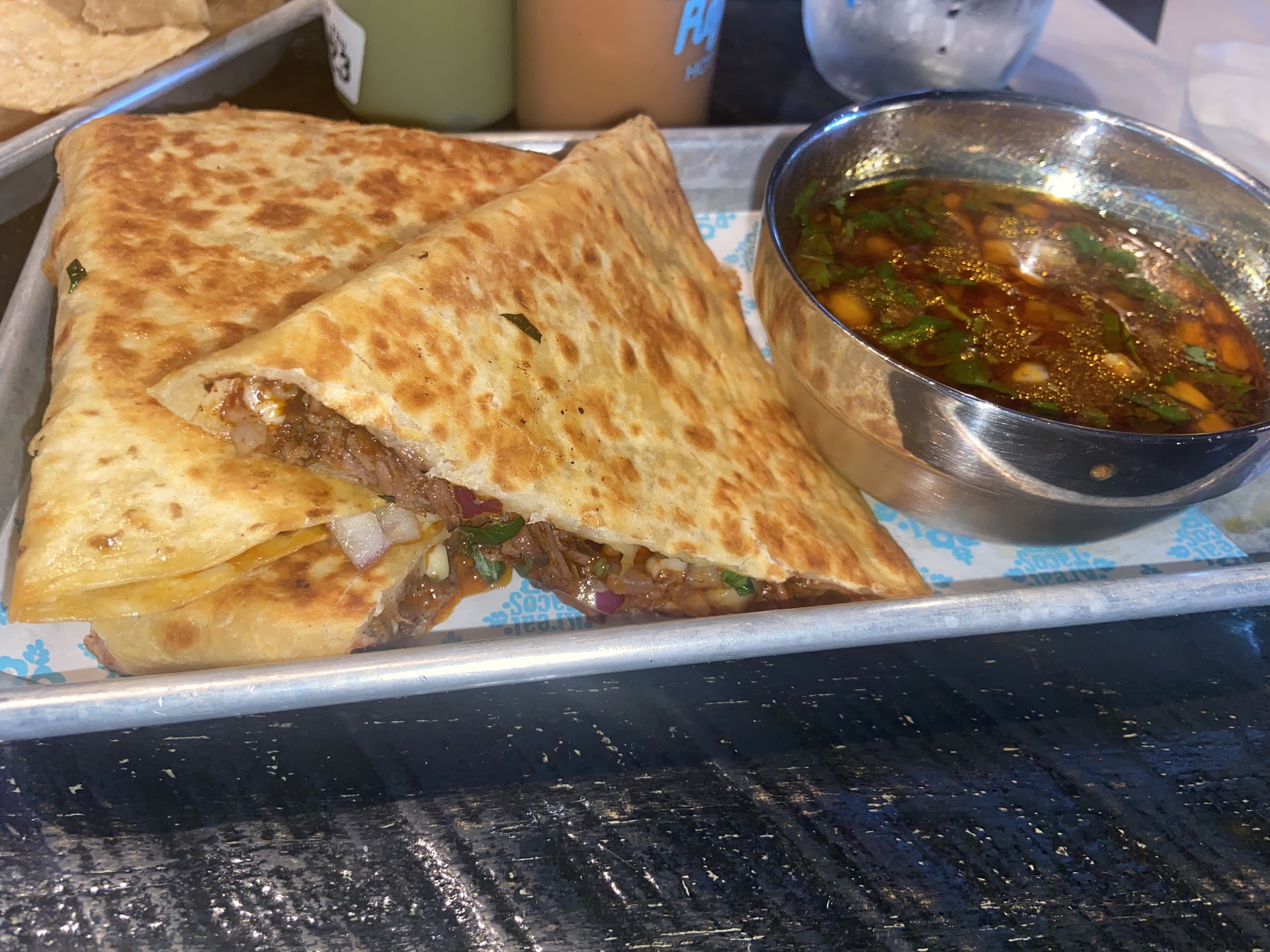 Quesabirria: Birria Barbacoa Quesadilla with cilantro, onions and consomeĢ; This was absolutely amazing. The meat was tender and in abundance. You could taste the care that was put into the creation of the meal. The flavoring put me in the mindset of a savory pot roast. Dipping the quesadilla into the consomĆ© really puts it over the top. It was like a perfectly seasoned and simmered beef broth. Oh My Gosh!!! Iām talking out of this world savory goodness with an abundance of flavor. Iām in love.