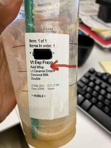 This is the 2nd or 3rd time Iāve picked up my mobile order like this, the pics will show that you canāt put whip cream in a cup with a flat lid. Soo, although Iāve drank most of my beverage, you can clearly see where my straw is, the type of lid used, what was supposed to be in my beverage. They did add caramel drizzle, but I guess they decided not to put whip cream on it. Wasnāt aware they had that choice but, no need in paying $15 for drinks & a sandwich for them not to be made the way Iām paying for them to be made..