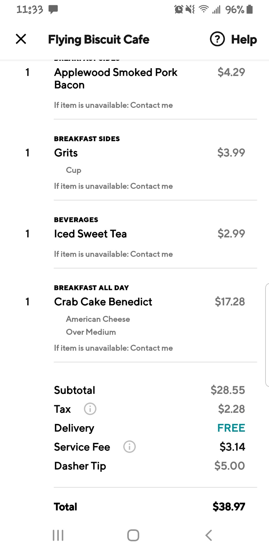 Read moreDON'T ORDER FROM THIS PLACE. I was in Atlanta the weekend of June 19th. I've been there before and have always enjoyed dining at the Flying Biscuit. This time I decided to order my meal through Door Dash from this location (Saturday, June 20th). One of the items I ordered, Crab Cake Benedict, was no longer on the menu. I didn't receive a call about my order, even though I specify so whenever I place an order with any restaurant through Door Dash. (I've also seen restaurants include my number on my receipt when my order is delivered.) My food arrives. No Crab Cake Benedict. I asked the driver about it. He said the restaurant told him they would refund me my money. So I called the restaurant and spoke to the hostess. I told her the problem. She then asked me, "What would you like for me to do?" TO EAT. I had to ask her about resolving the issue. She told me that the person she was training was new and didn't call me about my order. She then proceeded to tell me how Door Dash works as if I didn't know. She allowed me to place another order and said it would be "free of charge." It wasn't. I was charged for the item that wasn't on the menu as well as the second order. When I got home, I called the restaurant again to complain about my service. I spoke to the catering manager, Carolyn. She promised to resolve the issue and get me my refund. TO THIS DAY, I STILL HAVE NOT BEEN REFUNDED MY MONEY. I've since ordered from other restaurants and was able to see what they do when an item is no longer on the menu: someone calls to inform you in addition to taking the item off your receipt; the refund is noted on your receipt and the money is returned before your order arrives to you. Why couldn't this...