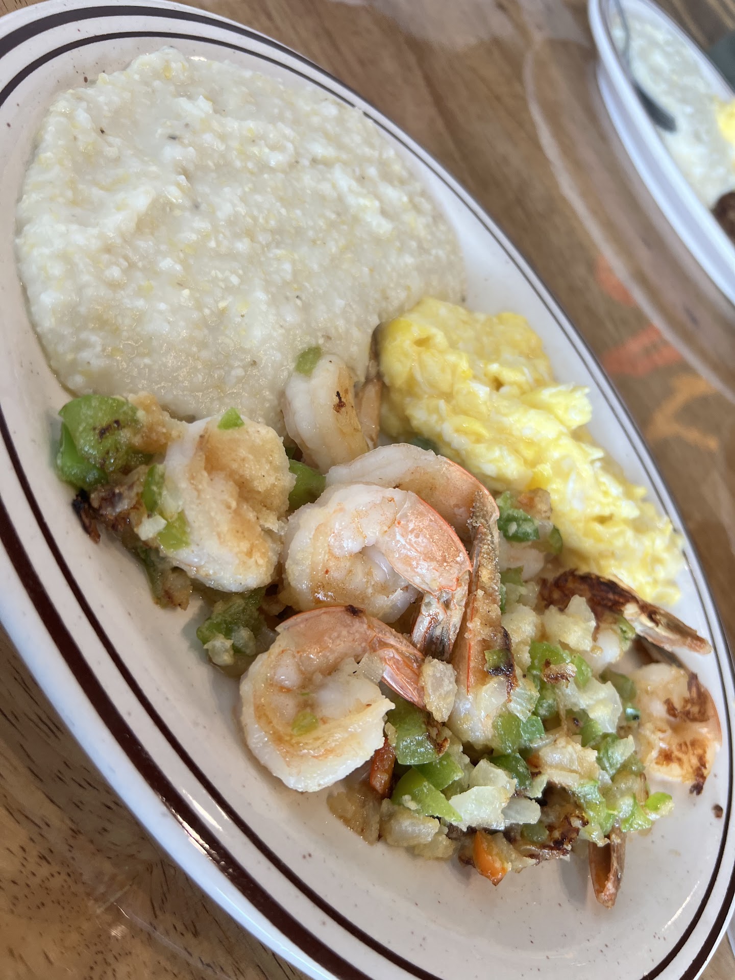 My partner and I randomly chose this place to try out for breakfast. This place is a straight forward with no frills type restaurant. Which can be appreciated if you truly want a simple breakfast with no extra bells and whistles. They had a pretty large menu that is suitable for several dietary restrictions. It offered turkey sausage, vegetarian options, and seafood options. I chose the Grilled Shrimp with Grits, which came with 2 scrambled eggs and toasts. Additionally my partner chose the Deluxe Breakfast, which is your usual grits, eggs, a couple choices of meat, and pancakes. We were impressed with the portions and the customer service. However, outside of the pancakes..the food slightly lacked in the flavor department. I enjoy a balance in seasoning but I found that my shrimp which was cooked with peppers and onions left much to be desired. Nevertheless, the prices were amazing and I definitely plan to go back to try...