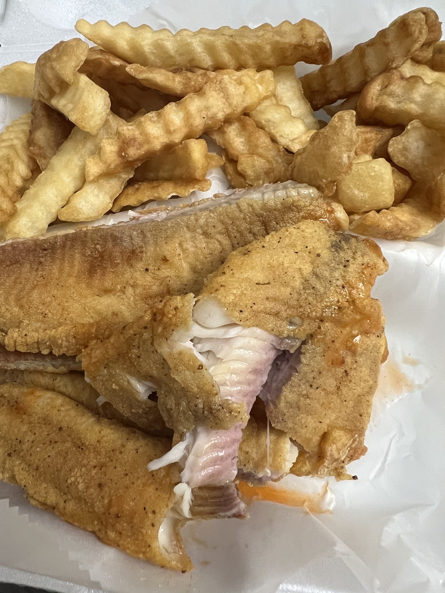 Read moreI was skeptical of this place but after reading the reviews I decided to give it a try. When I walked in to order the smell was horrible I can’t even describe it. The server was really nice though and made sure my order was correct. The food smelled really good in the car on the way home. My kid got a 10 piece extra hot w/fries and liked it. I got the 2 piece catfish w/fries and was not pleased. The first bite tasted odd so I broke it in half and saw the inside and realized why. Typically when restaurants specialize in making different dishes it’s expected for some of those dishes to not taste as great as the others. I didn’t have high hopes with my order so I kinda assumed it wouldn’t be too great. I personally wouldn’t go back here but hopefully some of the other dishes may...