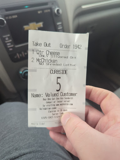 Read moreThe food was great, the people working the windows...awesome. The man brining food out to the cars waiting? Rude. I was missing something from my order. Of course the doors are locked so you can't go in to tell them. I go to the window to motion to someone that I needed help. He angrily points in no general direction and walks away. Never comes to the door to even ask what was wrong. I waited a few minutes and he comes out to bring food to another car. I say I am missing something from my order. He yells at me "I told you to go to the window!!!" Ummm...no sir, you did not. I then had to cross in front of drive thru traffic and hold the line up to get the rest of my order. Of course this McDonald's is busy. So I felt awkward standing there in 20 degree weather just waiting for someone at the window to acknowledge I was there after standing for 5 minutes. Mistakes happen. I get it. They were super busy. But to be rude when we're all trying to navigate through something no one has before....uncalled for. It costs $0 to simply say in an calm tone that someone at the window would help me and not in a tone that seemed like I should just know what to do. I work in customer service as well...and could never imagine acting like that let alone still having a...