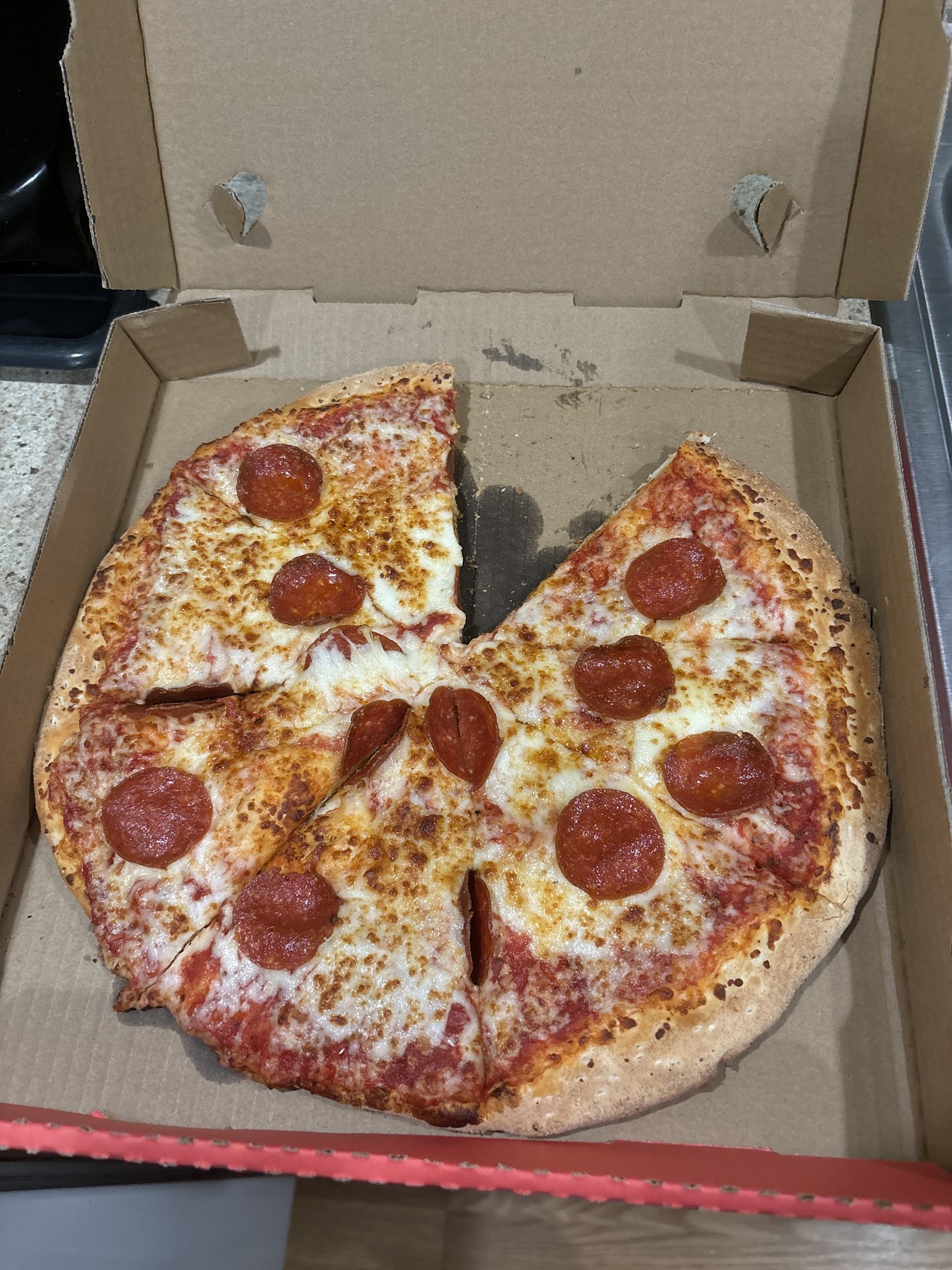 Trip 1: Store was clean. Manager took order. Ordered x1 Pepperoni and x1 Cheese. Nothing premade so I waited about 15 minutes. Pizza was fresh, hot, and yummy.
