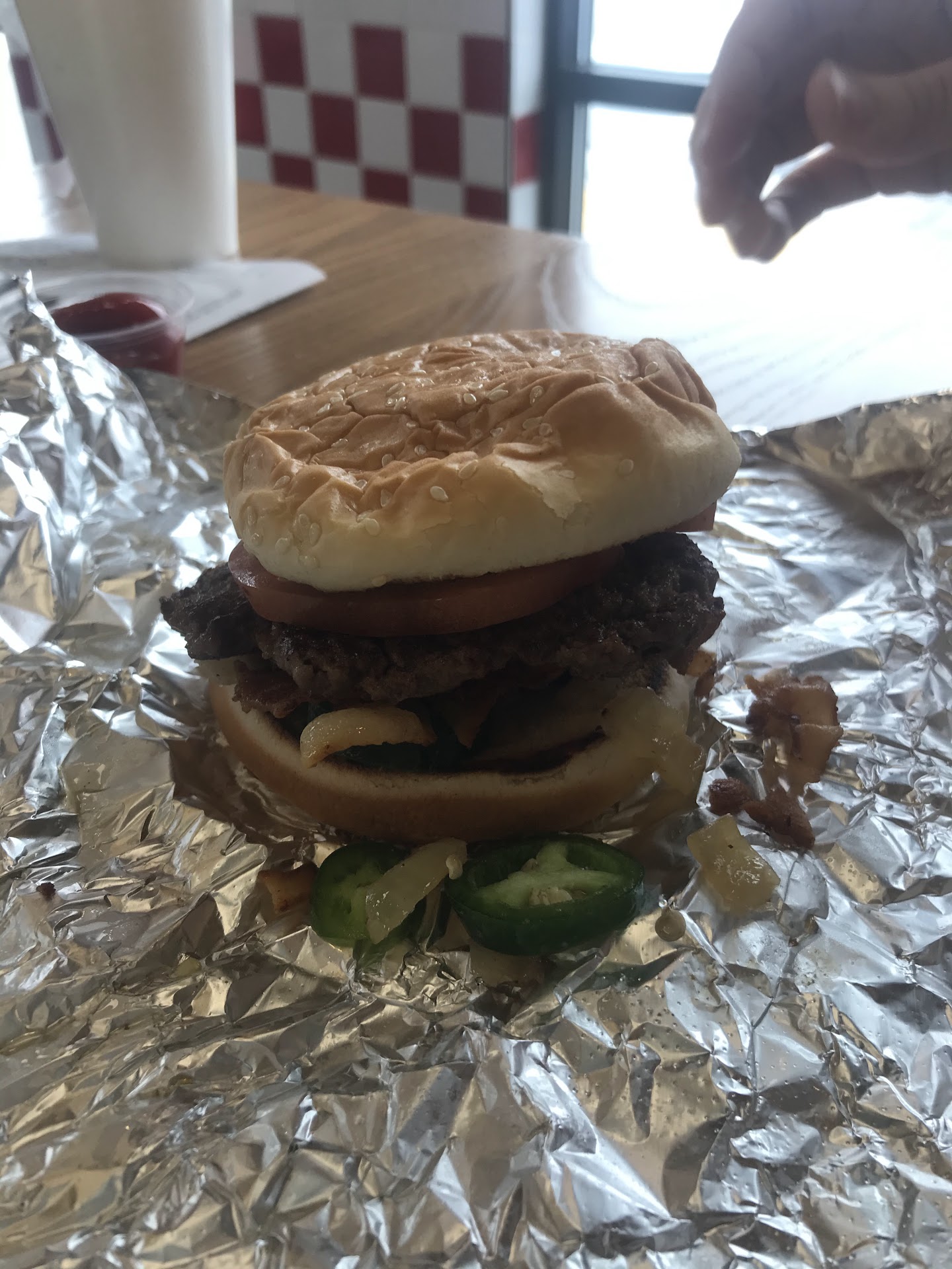 Read moreMy family was in the mood for good, 'restaurant quality' hamburgers last Sunday evening, and we were delighted to find this place was open. A client of mine recommended Five Guys for their gourmet cheeseburgers, delicious shakes, and overly generous portions of fries. They did not disappoint! These burgers are freshly made, grilled to perfection, are deliciously customizable, and have a mouthwatering variety of toppings. The impressive portions of fresh fries you'll find overflowing in your bag, paired with their phenomenal fry sauce are sure to satisfy that fancy fry craving. 4 chocolate Milk shakes, 4 orders of fries, 4 fountain drinks, and 4 (small 1/4lb) cheeseburgers later---our bill was just over $60. Definitely delicious, but priced a little to high for my taste. Now that I'm privy to the generous portions, next time I'll order accordingly to better suit my budget. Overall, the food was fantastic, and the service was superior! 5 Stars for...
