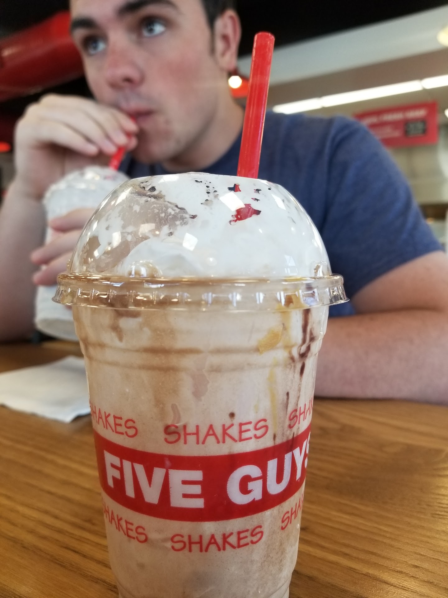 But while that aspect of this 'restaurant' is obviously regrettable, it is not the reason behind the 'demonic' aspect of the building. The true cause is the fact that the interior design consists of walls plastered with self-congratulatory news/magazine articles proclaiming the virtue of Five Guys. I suspect that these articles serve two purposes: first, to stroke the clearly massive and insecure egos of the founders of Five Guys (like many business owners, being plagued by massive insecurities that can only be soothed by surrounding themselves with hundreds of articles proclaiming that they are God's very special and creative Good Business Boy for their travails). The second is to subtly gaslight the customers into mistakenly beleiving that this institution deserves even a crumb of respect by presenting them with what would seem to be evidence to the contrary. Either way, this obvious attempt at psychological warfare is not going to be effective at anyone whose brain is more developed than that of a preschooler's (which isn't saying much considering the country that we live in), and it makes the entire building have a tacky and chintzy look to it.