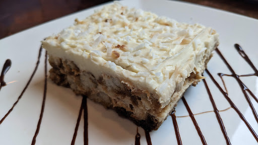 Finally the tiramisu. I'm a tiramisu idealist, so seeing that mascarpone was actually used with ladyfingers was a draw we couldn't say no to. But it was just okay. The mascarpone was kept essentially thick and untreated on the ladyfingers which I think were dipped or soaked with a coffee liqueur. The menu says espresso and rum, but it tasted more like a liqueur to me. Then the whole thing was topped with almost toasted coconut. That choice was quite the mystery to me. A non traditional topping that is simply not better than cocoa or chocolate. If you are looking for a creamy delicate dessert with smooth coffee and chocolate tones, you won't find it here. Are all of the ingredients yummy. Yes, but what a disappointment when most of the ingredients are expensive and correct, but not put together properly. This isn't sponge cake and whipped cream, but it's not a quality tiramisu either.