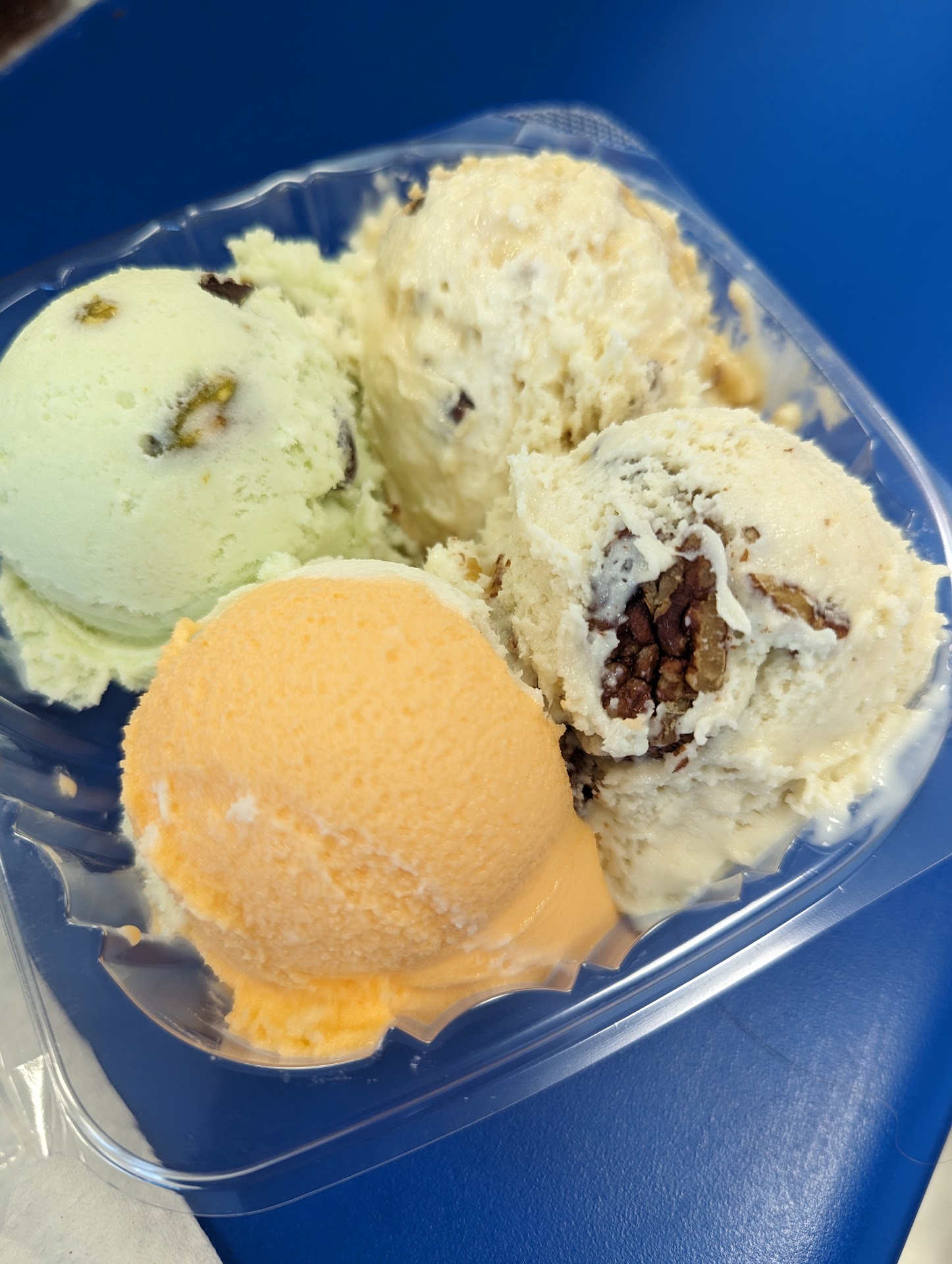 Read moreIf you're looking for great ice cream, this is it! They let you sample flavors first, which is dangerous because there are so many flavors to choose from in general. Each flavor is either loaded with the toppings or has such great flavors. The pistachio had so many pistachios in one single scoop. The coconut caramel was amazingly delicious with coconut flakes throughout and large chunks of coconut candy. The butter pecan was absolutely delicious, packed full of pecans and the butter flavor jumping out at you. The orange sherbet is just delicious! Tastes like the push pops growing up. Hubby absolutely loved the buckeye flavor because not only was it fresh fudge and peanut butter, it had tons of buckeye candy inside of it too. The price wasn't bad either! The sampler was $6.95 and you get huge scoops! I wasn't expecting such a full scoop! The staff was really great too! She was super helpful and friendly! Plenty of indoor seating as well as bathrooms. This is a great location to come have some ice cream with friends or...