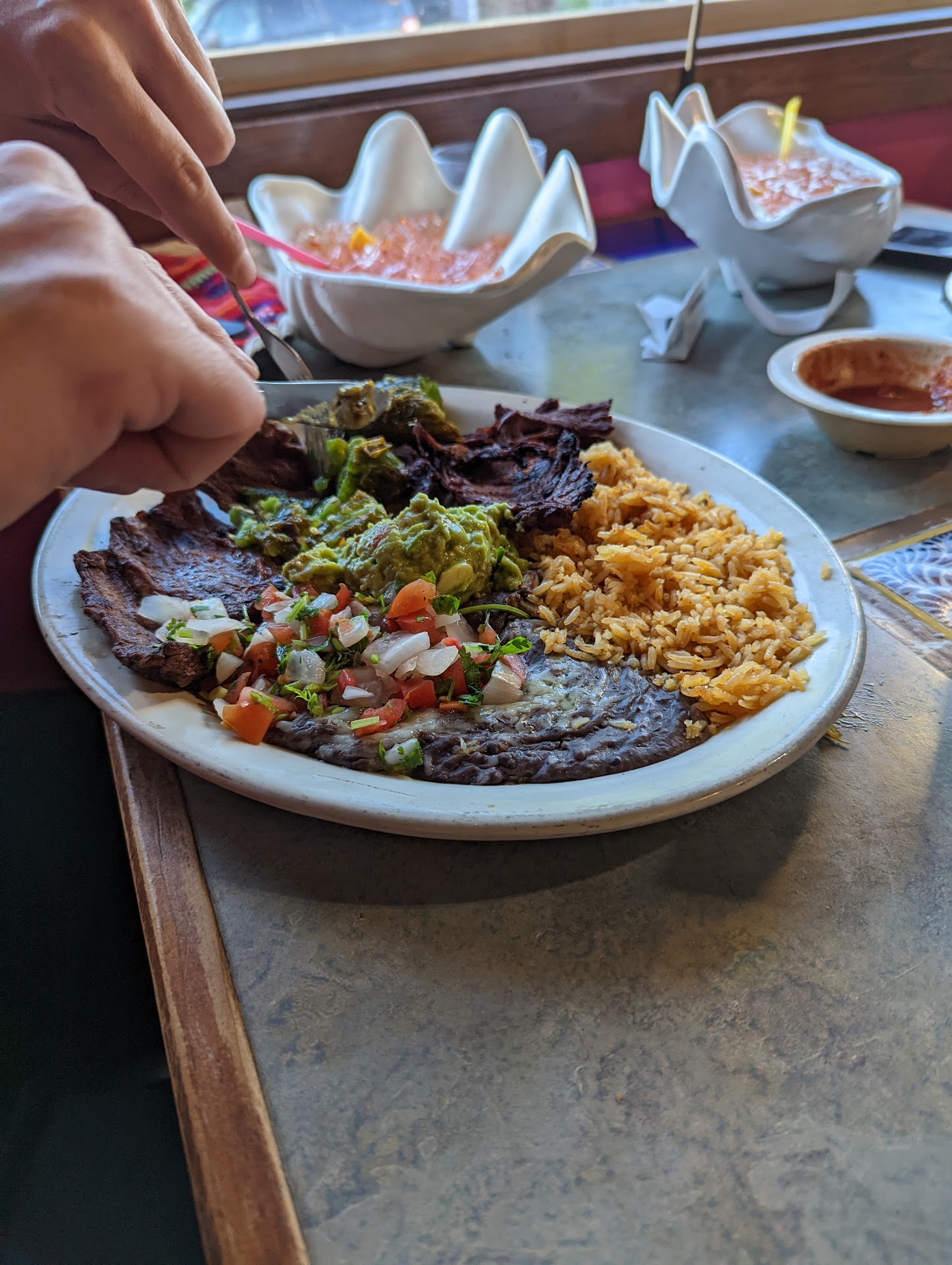 Read moreStarted well, seated immediately, three or four tables of diners on the patio a couple and a large family group inside. It was very hot inside at 9 P.M. Served warm but in need of salt chips and thick, well seasoned (but no heat at all) salsa. It's hot and we got tiny glasses of water that when we drank quickly they gave us a pitcher. (loved that so I think the service has great potential) Then it went to hell. We ignored a passive aggressive, tacky bright green handwritten sign on the front door regarding not being open on Monday's so the staff all have a day off. Post your hours on the door and leave it at that, gawd. Another thing that makes me question the owner's attitude of doing business is that printed on the menu was a statement that no more than 2 (maybe...maybe it was 3) debit/credit cards per table would be accepted per table) W-in-the-actual F. Three couples go to dinner so one couple pays for the other? Or do the first and second couple split the third couples meal. Running a credit card cost a business....almost like there is a term for that....the cost of running a business? The menu was overwhelming, many of the items have mole sauce. Very few vegetarian options and in a restaurant where peoples reviews say "stay away from the beef" that was a bummer. The prices were high. Husband asked if the tortillas for fajitas are warmed on the grill and the response was: microwaved. For $15 we had some microwaved "Mexican" food at the 7-11 on the way home. We were honest we weren't willing to have microwaved food at a restaurant and excused ourselves. Our waitress (who's name I know but feel it's too rude to post that) asked us to pay $4 for the chips/salsa. We traded her for...
