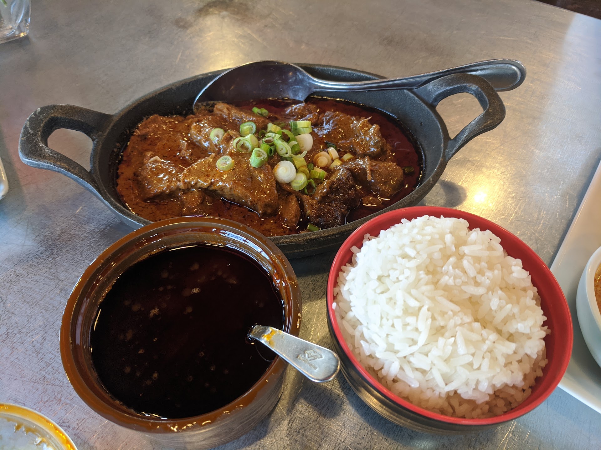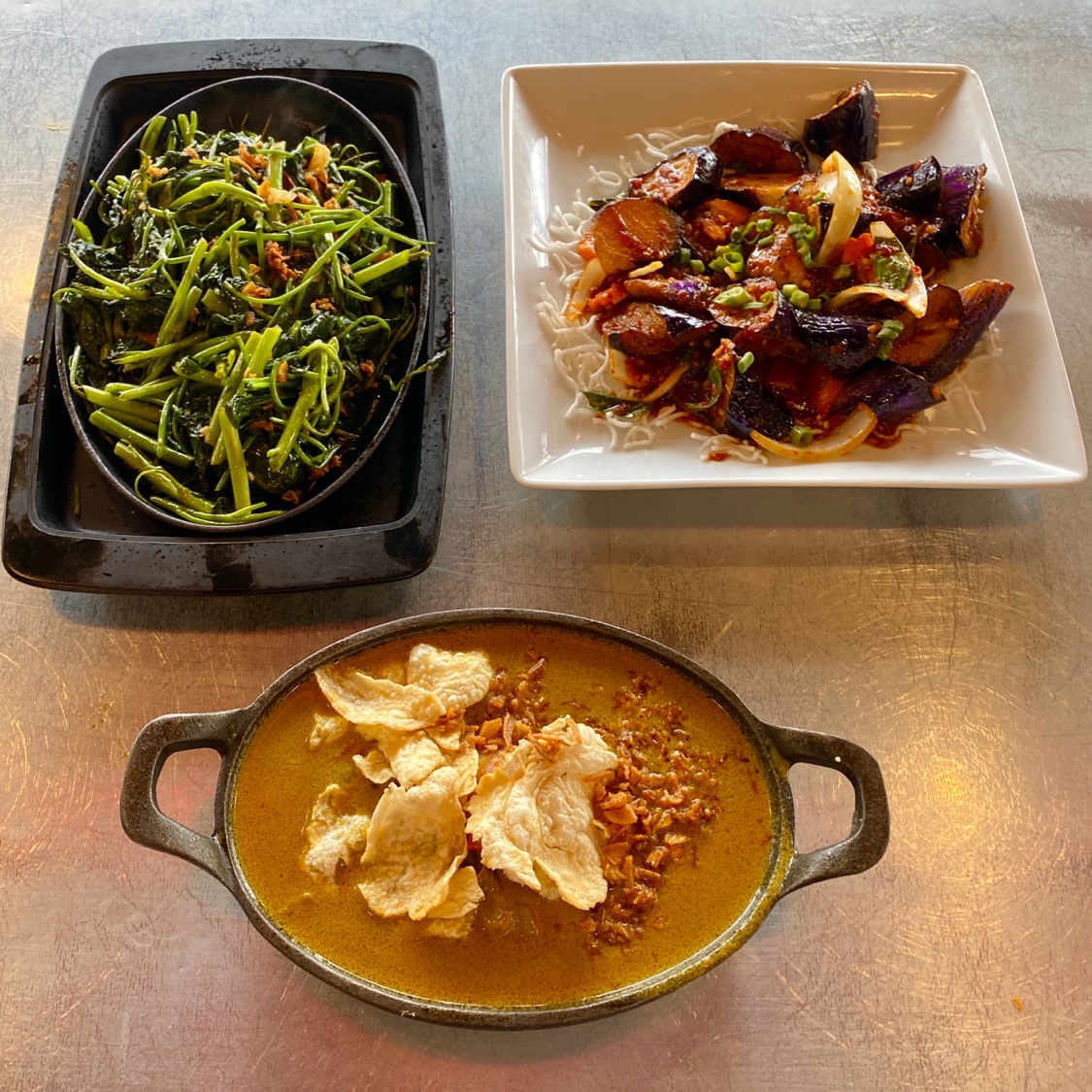 Service was quick and efficient. The food is made to order, but mine didn't take long. I ordered Curry Goat / Gulai Kambing, which is halal goat cubes cooked in yellow curry sauce. It's described as "bone-in", but mine was boneless except for one tiny shard. I also ordered Stir Fry Water Spinach / Cah Kangkung, which is stir fried water spinach in garlic sauce. It arrived sizzling and fragrant on an extremely hot plate. Finally, I ordered Spicy Eggplant / Terong Balado, which is eggplant stir fried in Indonesian chili sambal sauce. It was sweet and salty, and had plenty of fresh ginger in it.