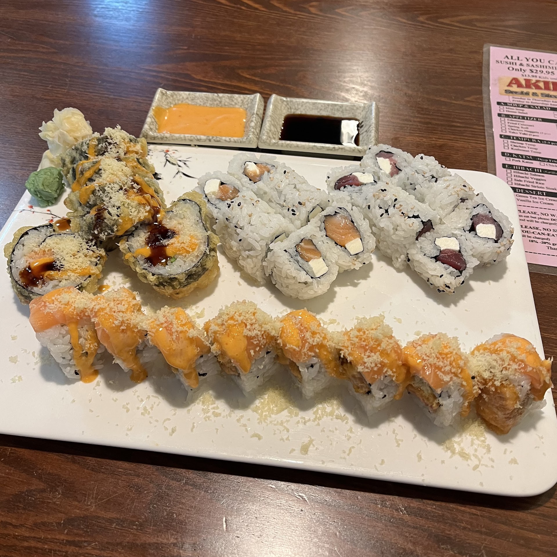 Ā Ā Ā Read moreBit of a mixed experience here, but more positive than negative. Arrived a couple min after 11am on a Saturday and the doors were locked and the lights were off. I called the restaurant and no answer. Annoying. Around 11:10am I was ready to go somewhere else when a car pulled up with three people in it, who rolled down their window and told me they would be open in a few minutes. True to their word, the restaurant opened a few minutes later. Once inside, I ordered the AYCE, which features appetizers, hibachi, and sushi options! One thing I really liked was the selection of sushi rolls, many of which included cream cheese! I ordered a salmon cheese roll, a tuna cheese roll, a Godzilla roll, and a double salmon roll and they were all very tasty! Well rolled and fresh! I was basically full because those rolls were quite large, but I wanted to try the hibachi sirloin steak, and it was better than I expected, tender and flavorful, with no fat or gristle! One other slightly annoying part of the experience was while I was waiting for my food, one of the employees (maybe someoneās kid, he seemed really young) went around the entire dining area with a broom and dustpan, and loudly slammed the dustpan against the floor every time he moved 6 inches, so I just heard him loudly sweep for about 10 minutes, an activity that someone who knew what they were doing could have done virtually silently. He also got weirdly close to me, and came within inches of literally sweeping...