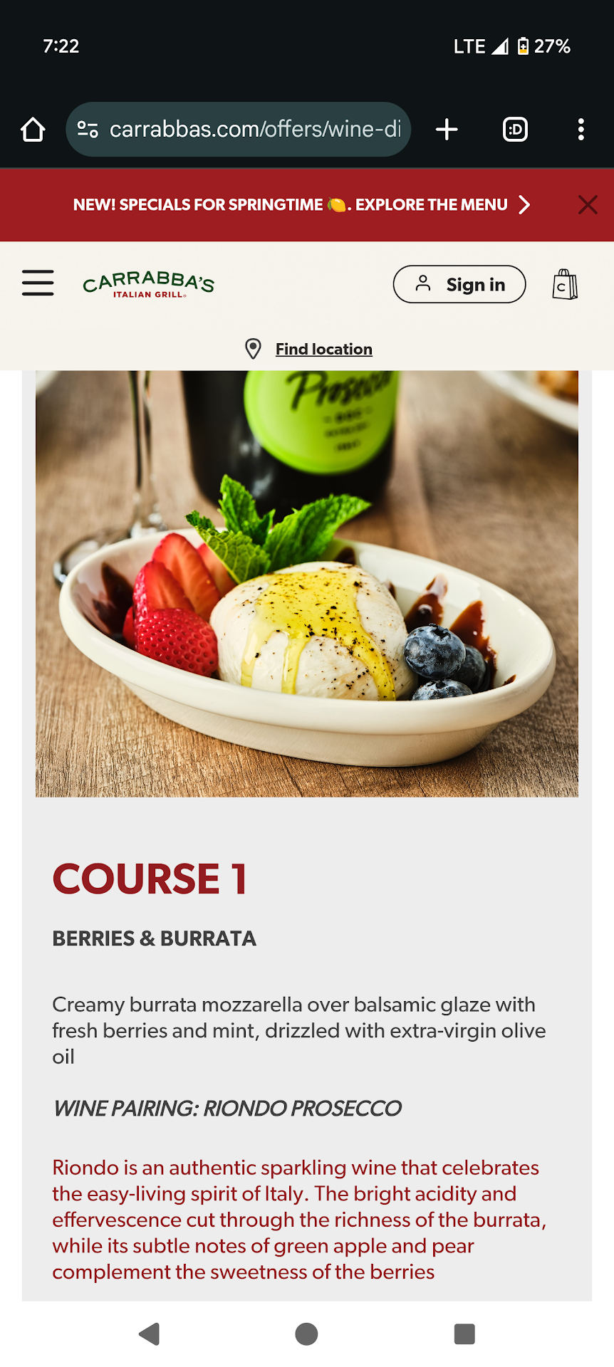 Read moreIt wasn't anywhere near a great experience at Carrabba's at all. The restaurant was clean that's about it. I started knowing that I wouldn't order the Chicken Trio again three hockey puck pieces of chicken topped for their respective dish with a side for $31 (I know the price isn't restaurant controlled) is way too overpriced. Then my wife orders the Italian Trio with the Lasagna that came with basically a brick as if it was cut from a giant pan and zapped in the microwave for 30 seconds to look like it came out of the oven. When we said something to the server Taylor she initially grabbed a separate plate had my wife slide the cold Lasagna onto the plate and said that she would have the kitchen warm it up. Which right away struck a red flag as that goes against food safety practices. Fortunately one of the managers returned with a new hot piece of Lasagna. All these food quality issues were on a quiet Friday night so there was plenty of time for the kitchen to check their work before plating and presenting. Now you can't change someone's personality but if you can read people you can tell when one's stage presence seems a bit forced. Taylor, she was nice but her inside voice was loud enough to be an outside voice which comes off a little fake and phony. Now my Wife and I have been to the Carrabba's in Altamonte Springs and the quality and service were better and if we were thinking about going to a Carrabba's again I would rather go there even though I live near this location. As a chain establishment, there should be food consistency and I don't feel like this comes close between these two restaurants. I feel like my Wife and I should have chosen the other Italian Restaurant Chain in the area as We Would Have Been Treated...