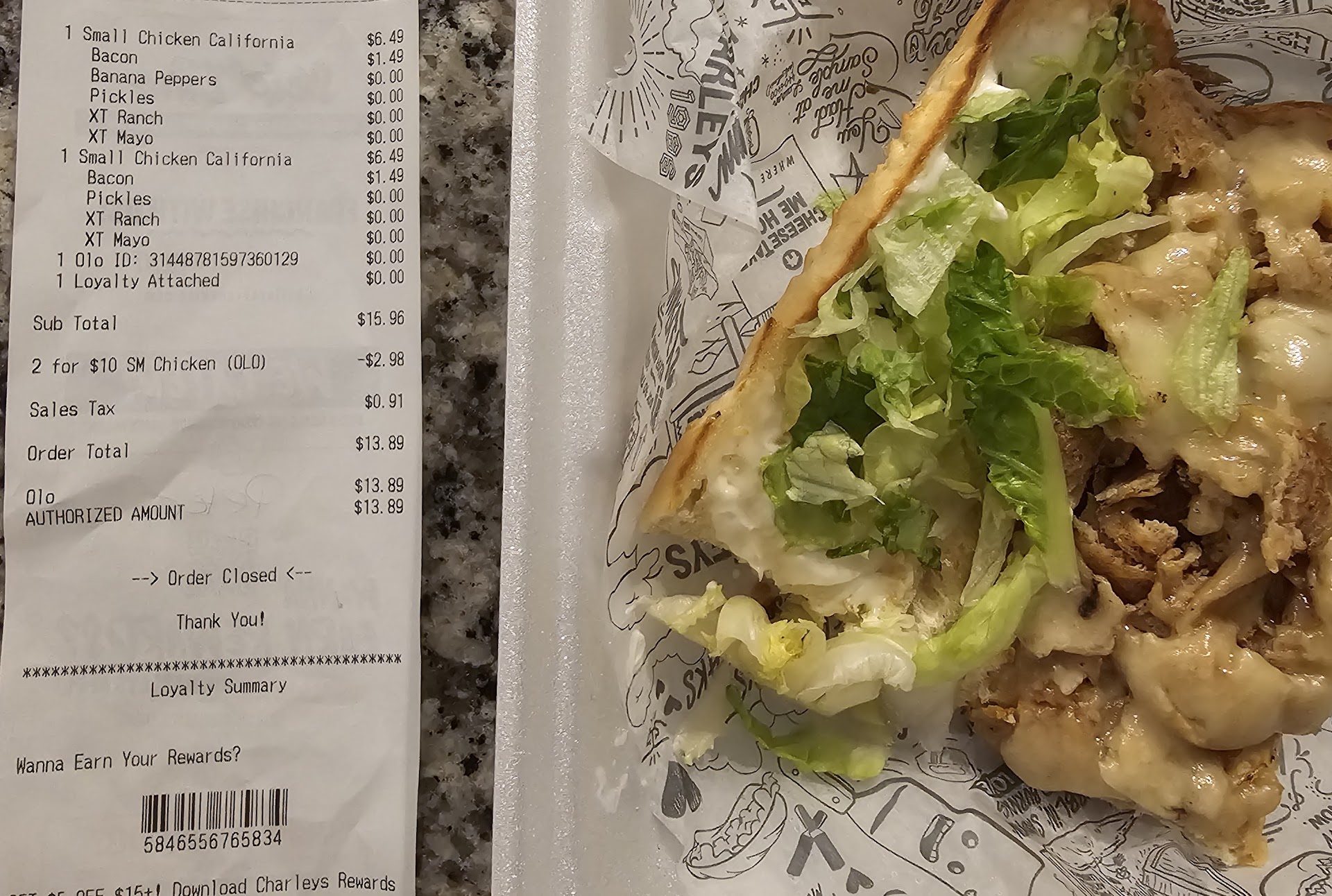 Read moreI’ve been feeding my family Charleys for years the food is great! I usually visit the Charleys in Seminole Town Center the manager there is very kind and the staff is always great and so is the food. They closed at 8 so I wasn’t able to make it in time so I decided to check out the Charleys located in the WalMart on Rinehart Road not far from the one I usually visit. Upon arrival I ordered my food and wasn’t asked what I wanted on my sub, I figured he would ask cause that’s what the others do usually people atleast as about mushrooms, but I swiped my card. After paying I begin to explain to him what I don’t want on my sub. He then says why didn’t you tell me before I put it on the stove. I replied you didn’t ask and they usually do. We went back a ford about it and then he stormed off with no reply after I asked him again he literally told me to “shut up” I asked for the manager and he said he is the manager super rude and walked off I was embarrassed he went to the back room and the staff helped me out and took care of my order. This guy needs to be replaced...