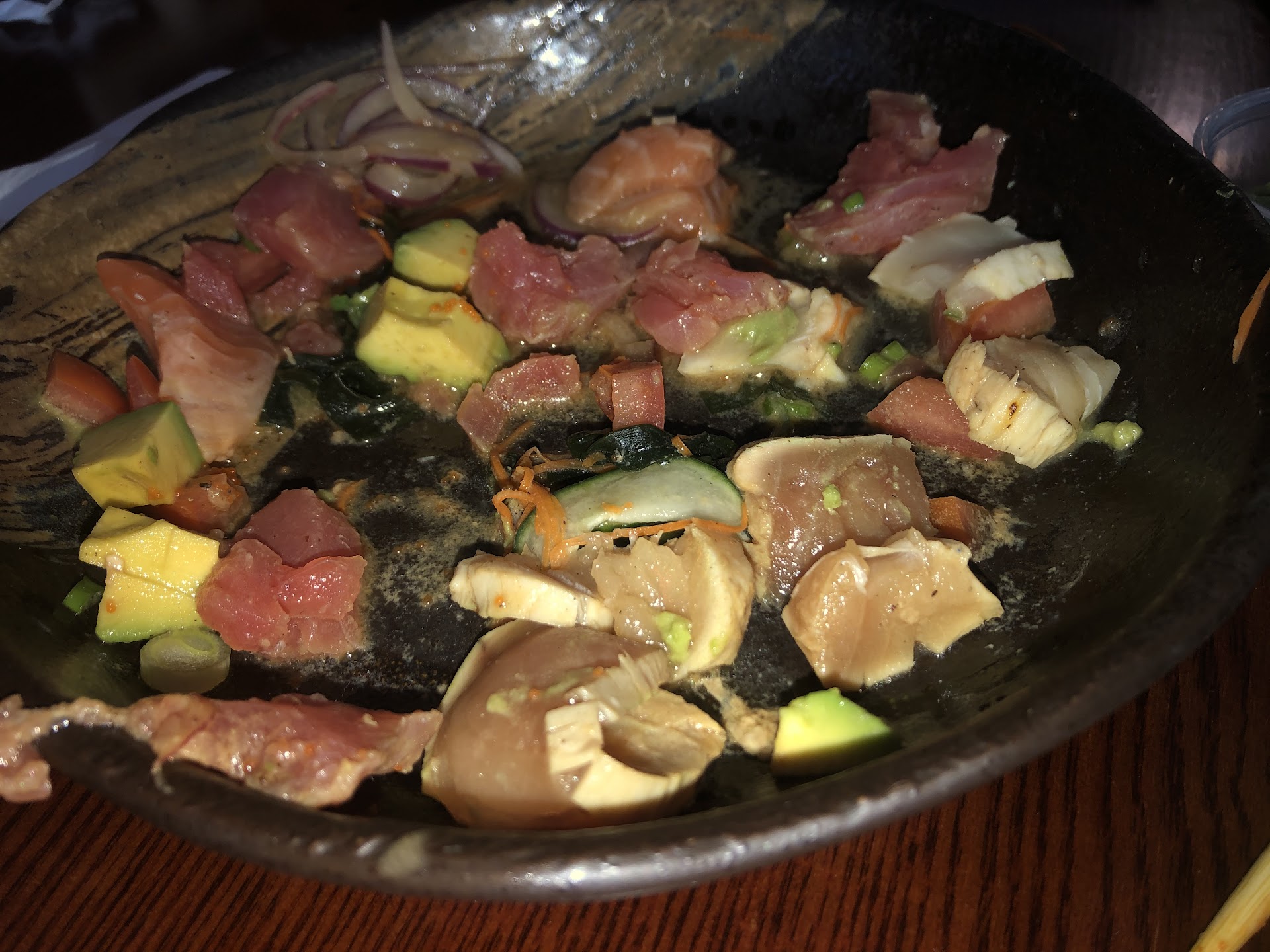 For dinner I ordered the “7-fish, sashimi salad”. I asked the waitress what types of fish were in it-but she was did not know. I asked if she could request to have it made without; eel, shrimp or yellowtail.