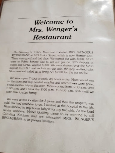 Read moreI've been eating here since I was a kid; my whole family enjoys the hospitality of (and has worked at) Mrs. Wenger's restaurant. In my opinion, they have the best sweet tea, best buttered toast, best potatoes and eggs, and best fried chicken. I haven't tried anything yet that I haven't liked. It's also the cheapest place in Sanford to get a plate of grits, fatback, or homemade redeye gravy, not to mention the outstanding service and vintage atmosphere. As an adult, I come here at least once a week, and I think back at how much this place has made an impact on the...