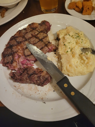 Food: We ordered an appetizer (fried green beans), a 14 oz dry aged ribeye and a 10 oz regular ribeye. We both got salads - I had a house; he had a cesear. I had mashed potatoes. We also got a house bread.
