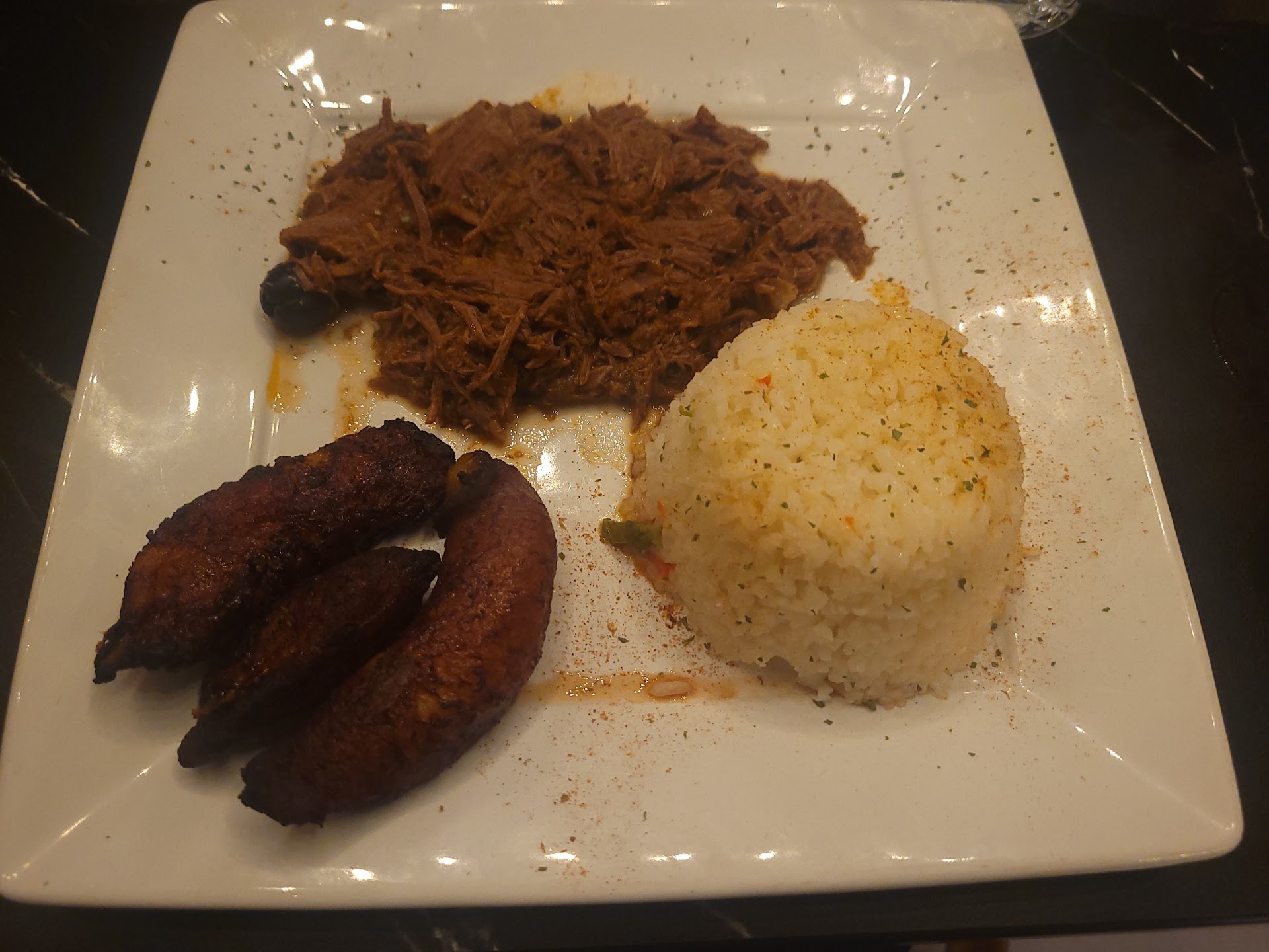 It took even longer to get our food than the drinks - maybe 45 minutes. The dishes all arrived to the table at different times. The server didn't clear out hardly any of the appetizer plates, so the table was a cluttered and cramped mess the whole night. My ropa vieja was fine, but didn't impress me frankly. It felt a bit like cafeteria style food, which made me wonder why it took so long. The sweet plantains tasted good at least.