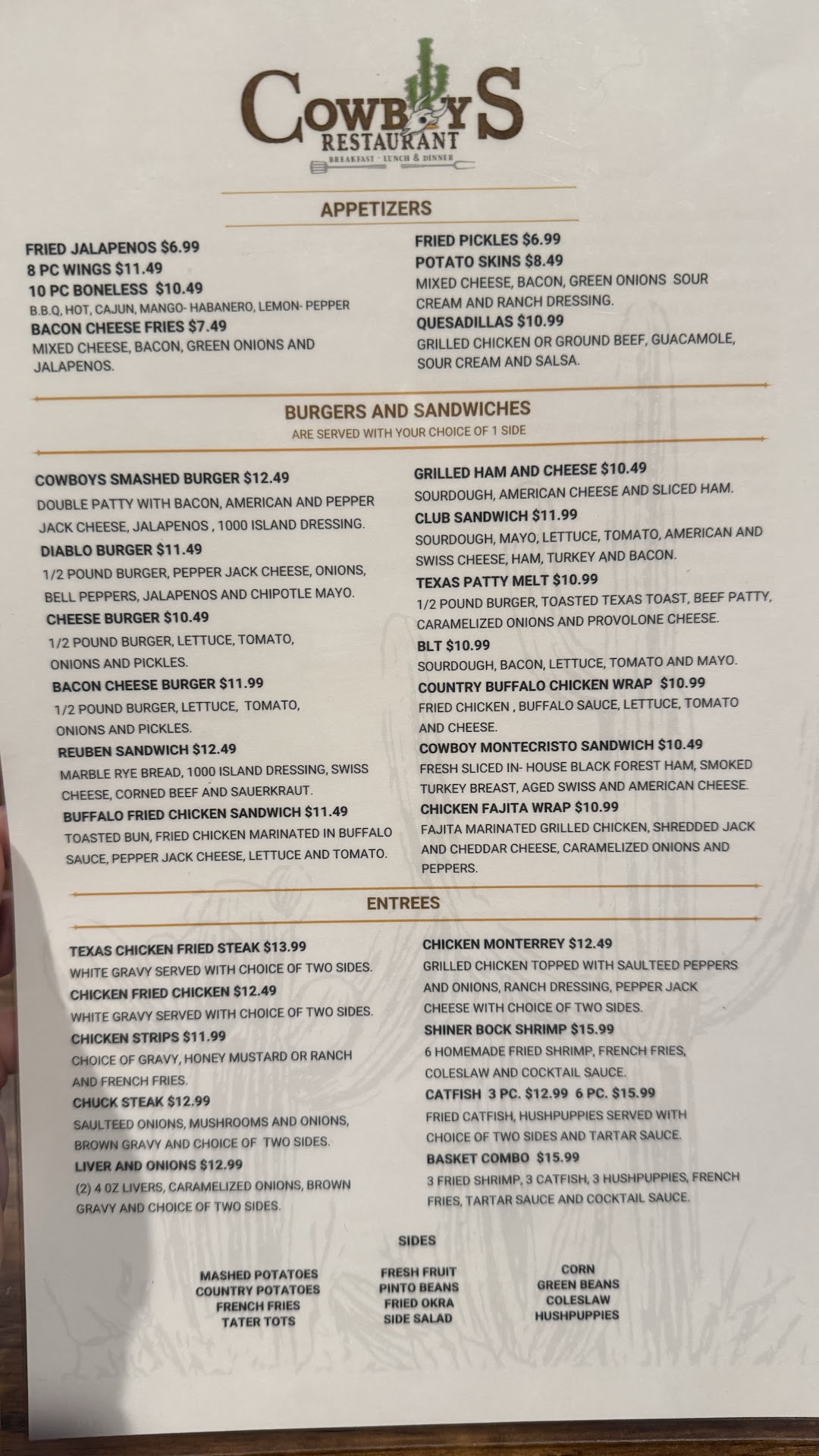 Read moreWhat a great surprise! We were traveling and decided to stop for lunch. We took a chance stopping at Cowboyâs in Sanger never having heard of them. It is a quaint little place with absolutely delicious food. My husband had the all meat omelette and he could only eat half of it because it was so large. I had a chicken quesadilla. Very tasty. The chicken breast was freshly cooked, not reheated. There was more chicken on this quesadilla than any other I have had. Very friendly staff....