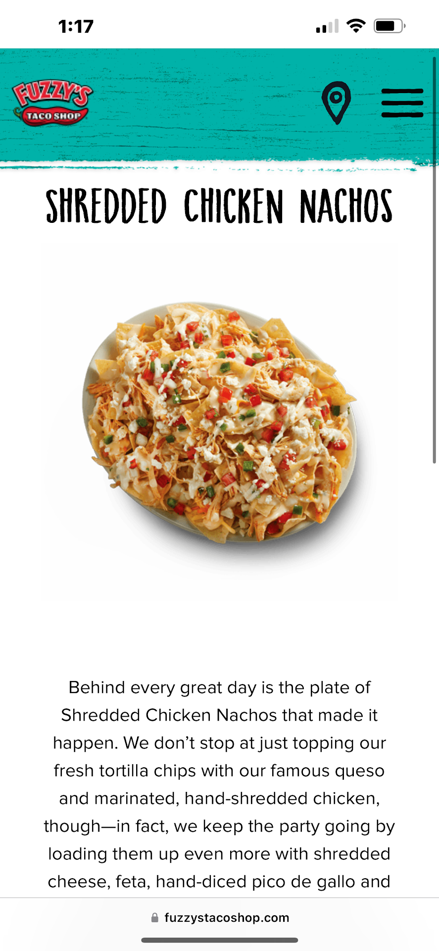 Ā Ā Ā Read moreI was having some insane cravings for nachos. I Drove 30 minutes just to get some nachos. I paid $1 extra for guacamole, and jalapeƱos. I drove 30 minutes back home. So excited to tear into this to go box and see a beautiful display of chip covered heaven. I open the to go box, and an absolute disgrace of chips and some shredded chicken looked back at me and could see nothing but disappointment on my face. I had about 3 ounces of shredded chicken, maybe 4 little pieces of jalapeƱos. And an "okay" amount of guacamole. When I say I almost started crying when I opened this box. I mean it. If I could leave a negative review I would. I would literally take stars off.. I deserve 2 stars just for having to eat a chicken and chips not nachos, and even having to leave this review for such a terrible meal. The menu says the shredded chicken nachos are supposed to be 1680 calories I believe? The only way that would be possible is if the tiny drizzle of the white cheese sauce is about 1000 calories per table spoon. I also added a picture for reference as to what my nachos are supposed to look like. What a disgrace. Iām not even mad, Iām just so very...
